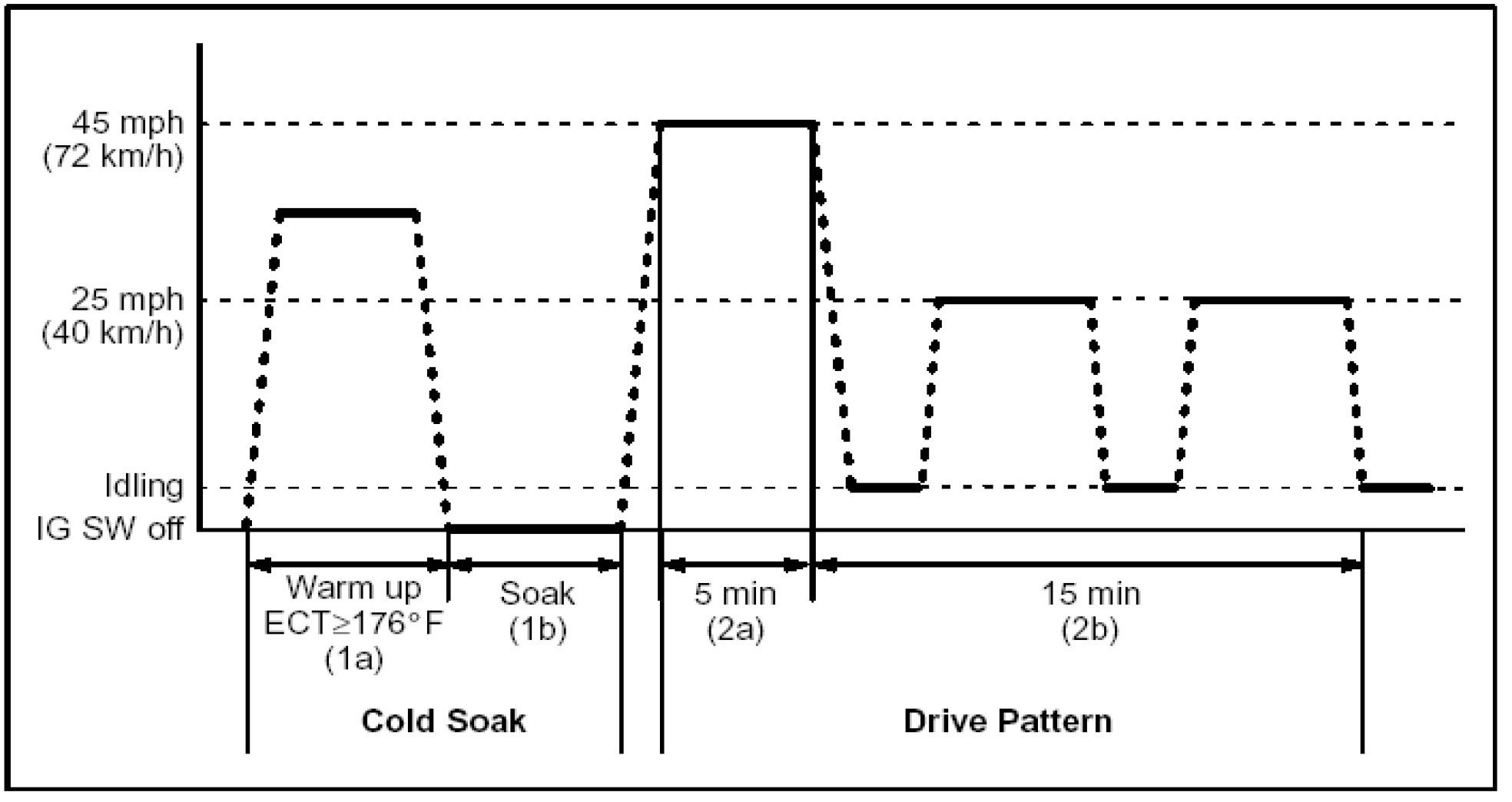 2b. Drive the vehicle at approximately 25 mph (40 km/h) for 15 minutes and include a minimum of two stops for approximately 30 seconds. (See illustration.)