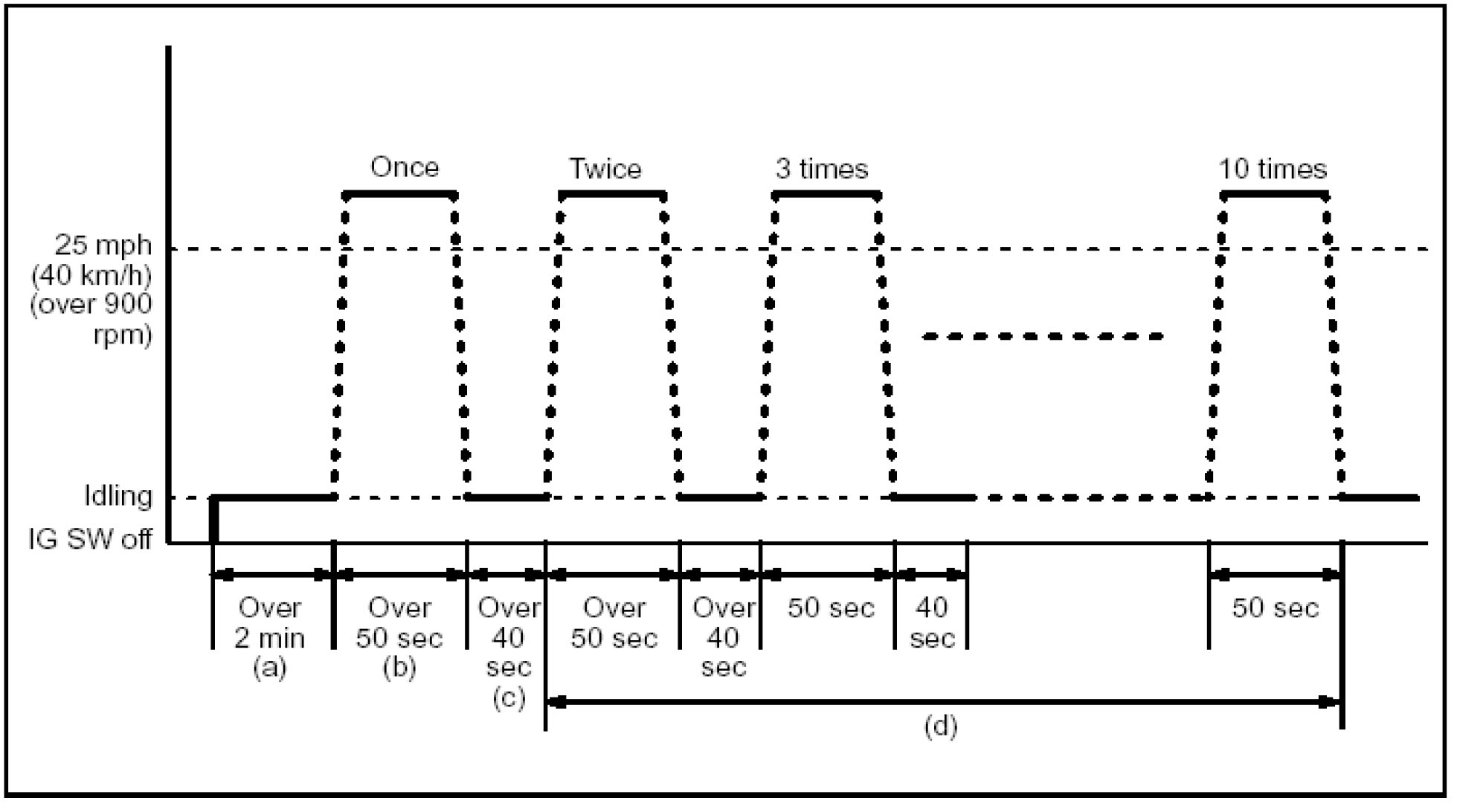b) Drive the vehicle at 25 mph (40 km/h) or more for at least 50 seconds. Be sure engine speed remains above 900 rpm.