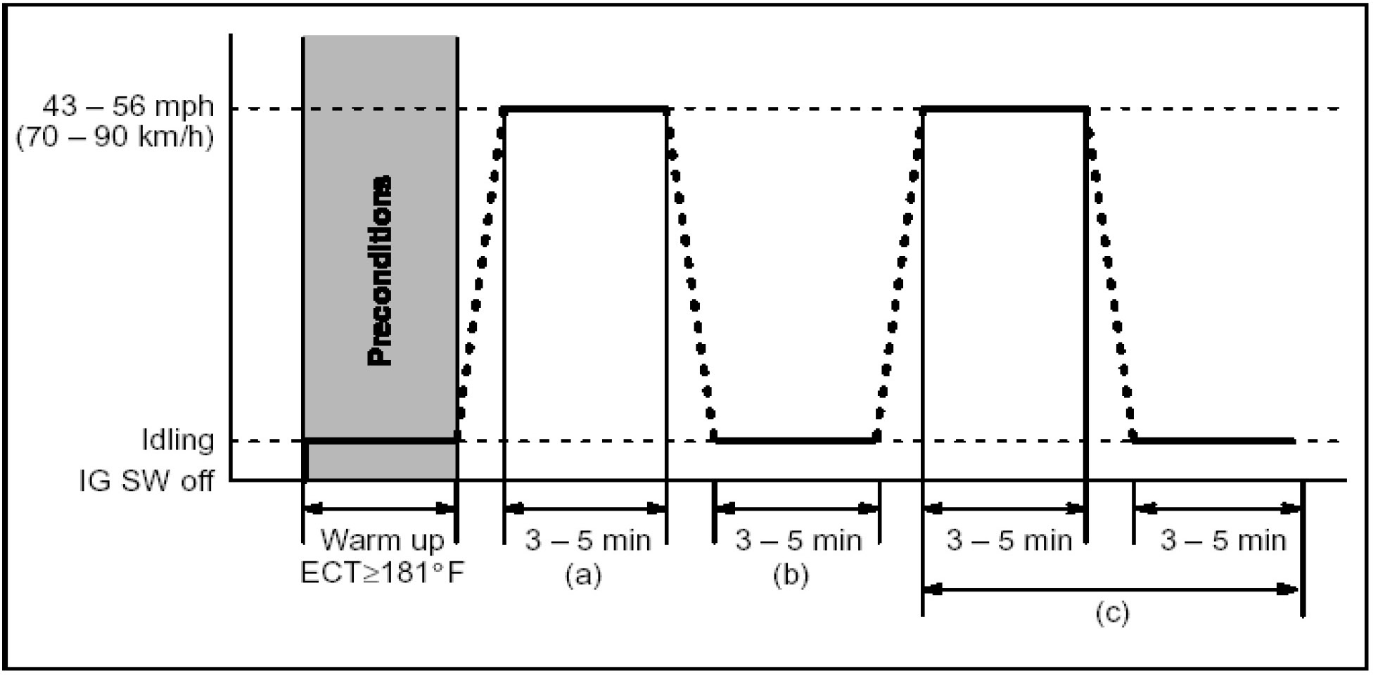 b) Drive the vehicle at 43 - 56 mph (70 - 90 km/h) for a period of 3 - 5 minutes.