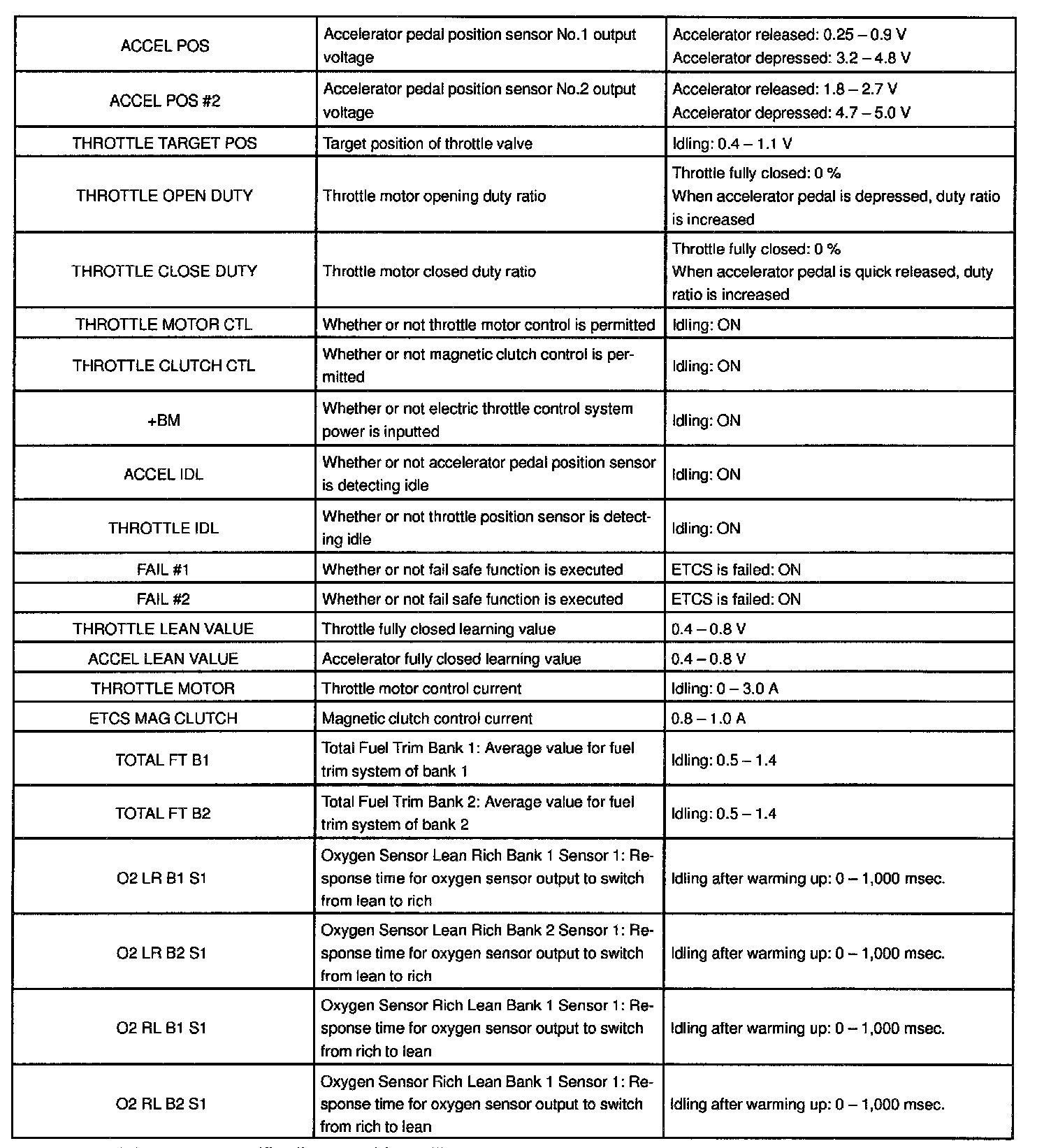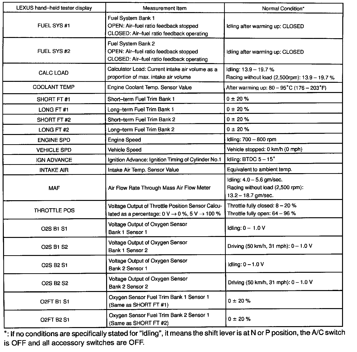 *: If no conditions are specifically stated for "Idling", it means the shift lever is at N or P position, the A/C switch is OFF and all accessory switches are OFF.