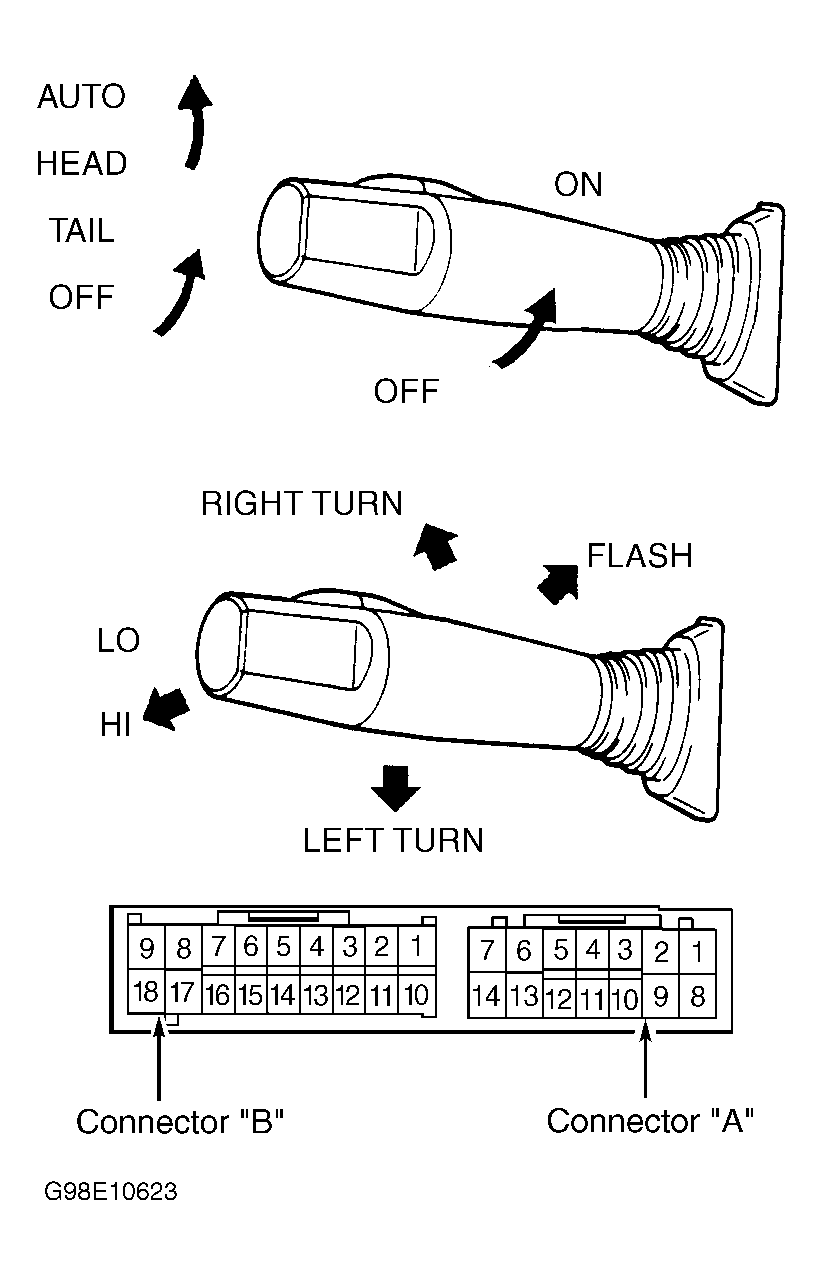 Remove steering column covers. Disconnect electrical connectors from combination switch. Using an ohmmeter, check for continuity between specified terminals of combination switch with specified switch in specified position. See appropriate COMBINATION SWITCH CONTINUITY table. See Fig 1, Fig 2 or Fig 3 . If continuity does not exist, replace combination switch.
