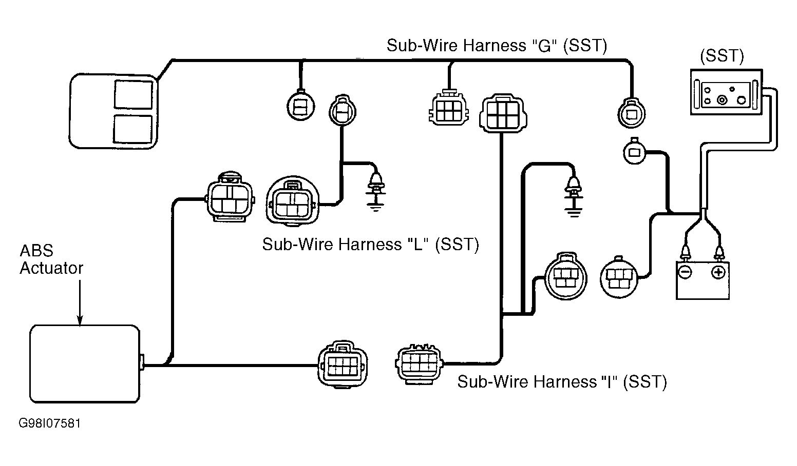 - Turn ignition off. Ensure battery voltage is 10-14 volts. Disconnect ABS actuator electrical connectors. Connect ABS Actuator Checker (SST 09990-00150) positive and negative power cables to vehicle battery. Connect Sub-Wire Harness (SST 09990-00250, SST 09990-00300 and SST 09990-00360) to ABS actuator connectors. Connect ABS Actuator Checker (SST 09990-00150) to sub-wire harness. See Fig 1. Connect Black cable of sub-wire harness to ground.