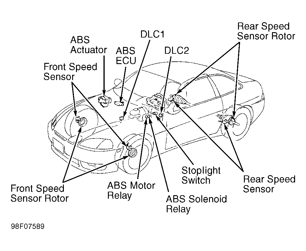 Anti-Lock Brake System (ABS) controls brake fluid pressures to each individual front and rear brake caliper during a panic stop to prevent wheel lock-up. System consists of actuator, solenoid relay, pump motor relay, Electronic Control Unit (ECU), and a speed sensor at each wheel. See Fig 1. If a system fault occurs, ABS ECU stores a self-diagnostic code(s) that can be retrieved to diagnose malfunction.