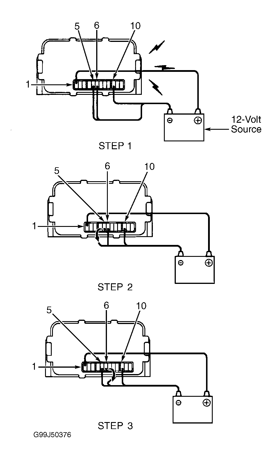 - Disconnect 12-pin relay connector. Connect positive lead from battery to relay terminal No. 1. Connect negative lead from battery to terminals No. 5, 6 and 10. See STEP 1. See Fig 2. Bulb should illuminate and chime should sound for 4-8 seconds.