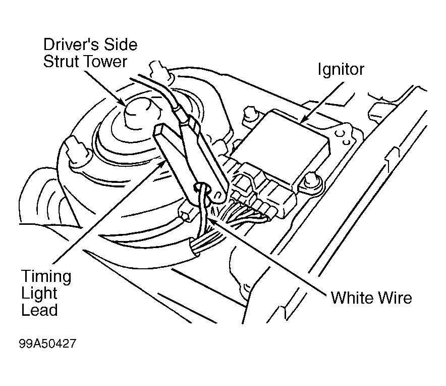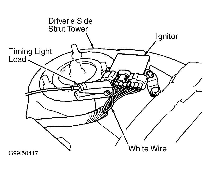 2. Connect timing light lead to White wire at ignitor. See Fig 2 and Fig 3 . Ignitor is located on top of driver's side strut tower.