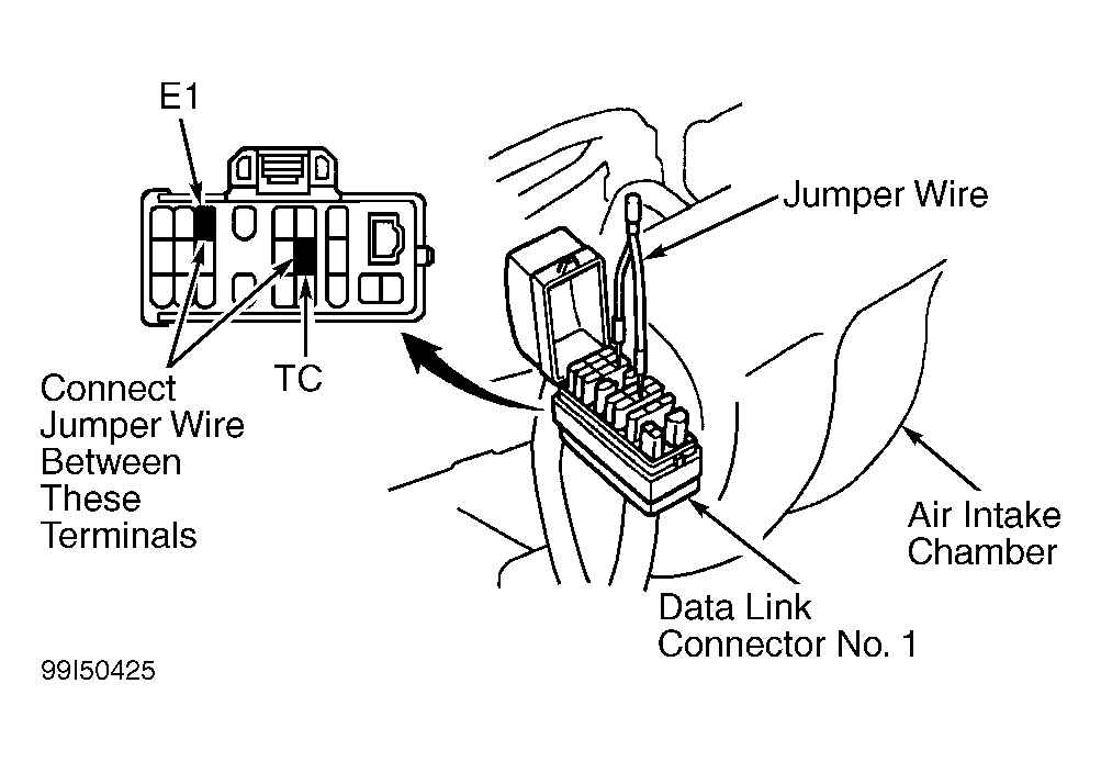 4. Install Jumper Wire (SST 09843-18020) between terminals TC and E1 on data link connector No. 1. On GS300, data link connector No. 1 is located near driver's side strut tower. See Fig 4. On SC300, data link connector No. 1 is located on end of air intake chamber. See Fig 5.