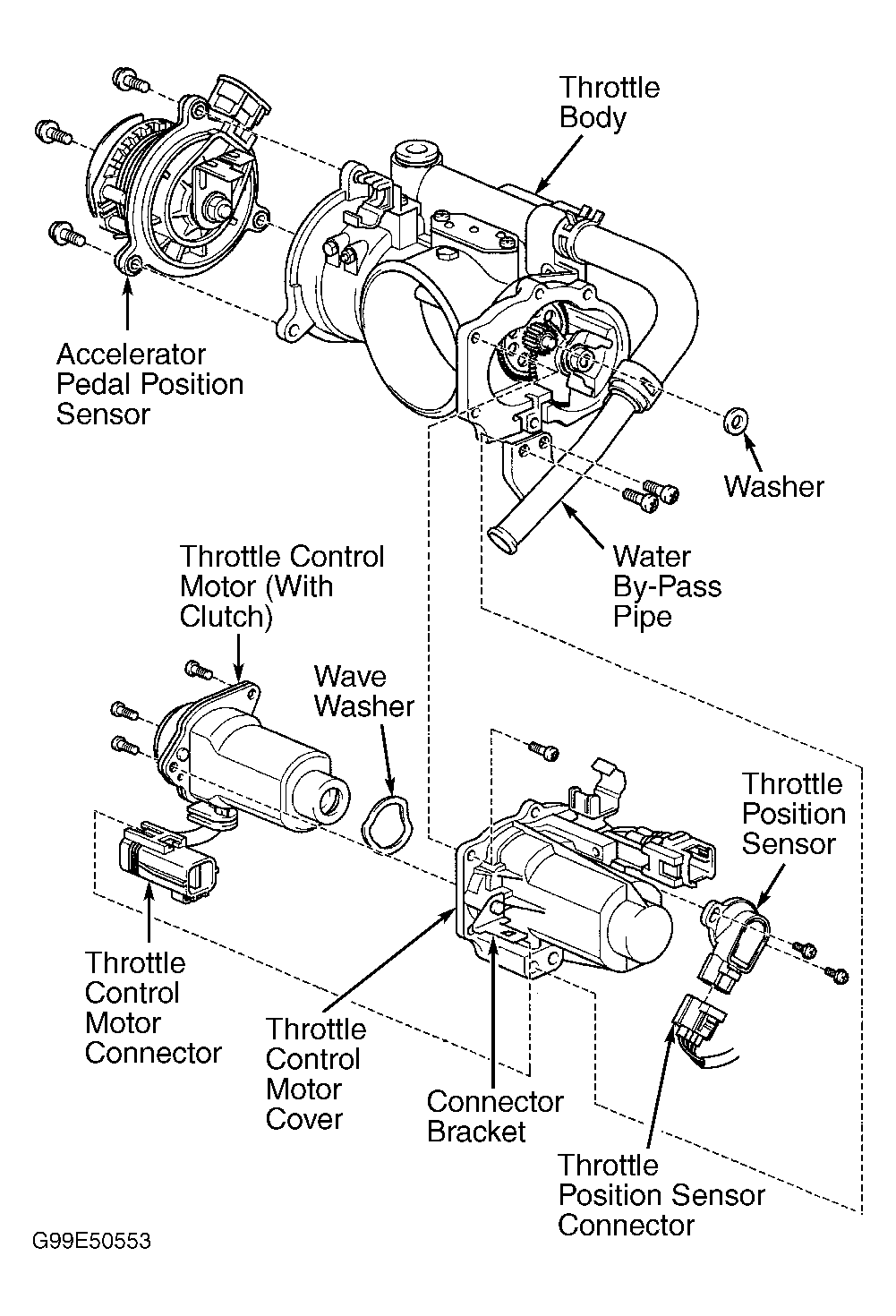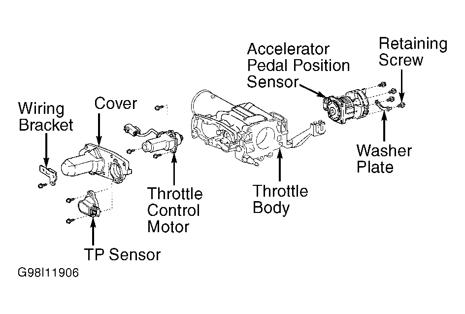 - If necessary to remove accelerator pedal position sensor, using small screwdriver, bend tabs on washer plate away from retaining screws for accelerator pedal position sensor. See Fig 1. Remove retaining screws, washer plate and accelerator pedal position sensor from throttle body.