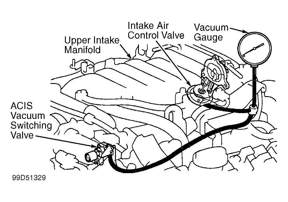 KNOCK SENSOR under ENGINE SENSORS & SWITCHES in REMOVAL, OVERHAUL & INSTALLATION article. Install a 3-way vacuum "T" fitting in vacuum hose between Intake Air Control Valve (IACV) actuator and ACIS Vacuum Switch Valve (VSV). See Fig 1. Reinstall intake manifolds and throttle body.