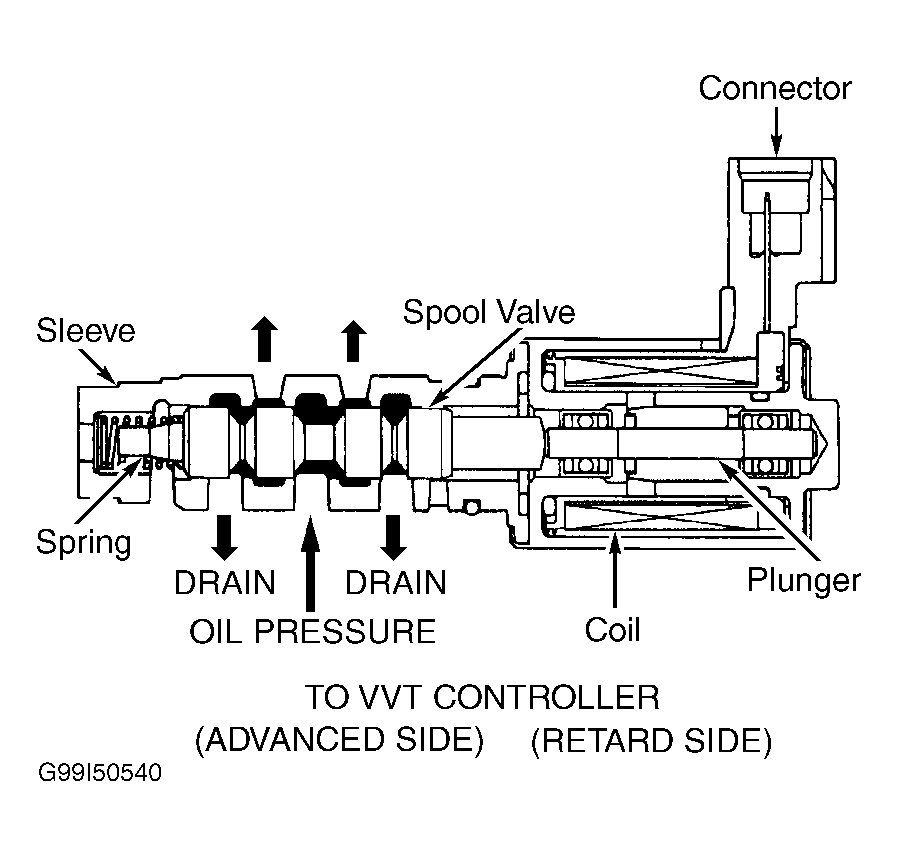Piston movement is determined by the oil control valve. The oil control valve is an electrically controlled valve that receives oil pressure from the oil pump. See Figure. The ECM uses input signals for engine speed, intake air volume, throttle position and engine coolant temperature to determine the operation of the oil control valve. ECM also uses input signals from camshaft position sensor and crankshaft position sensor for determining the actual intake camshaft valve timing. The ECM operates the oil control valve by controlling position of spool valve in the oil control valve. Positioning of spool valve determines which side of the piston the oil pressure will be applied on. By applying oil pressure on the piston, the piston will move inward or outward, causing the intake camshaft valve timing to change.