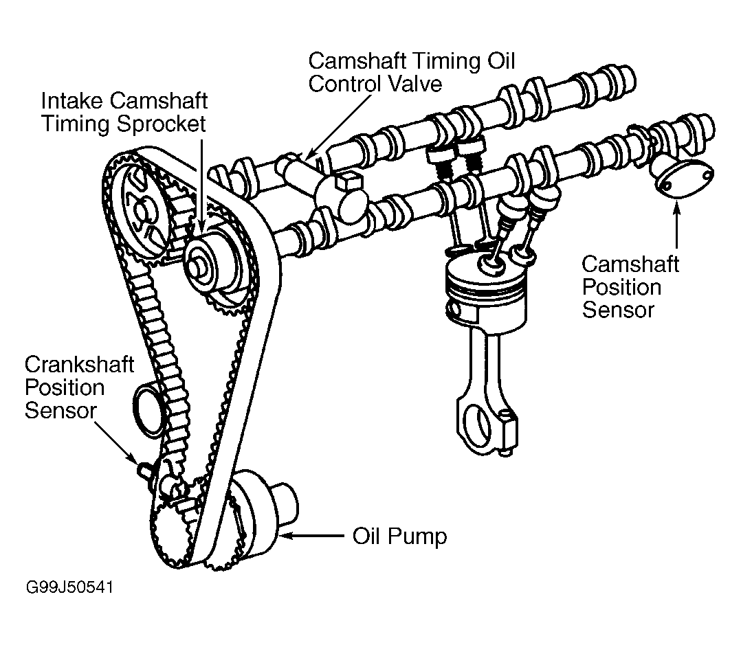 The VVT system controls intake camshaft valve timing to provide improved torque, improved fuel economy and reduce exhaust emissions. VVT system consists of a oil control valve, intake camshaft timing sprocket, crankshaft position sensor, camshaft position sensor, oil pump, Engine Control Module (ECM) and associated wiring. See Fig 1.
