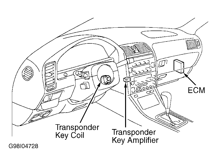 The engine immobilizer system consists of an Engine Control Module (ECM), transponder key coil, transponder key amplifier and key with built-in transponder chip. See Fig 1. When ignition key is inserted in ignition, the transponder chip in the key transmits an electronic code to the transponder key coil. The signal is amplified, and read by the ECM. The engine will start only when the key code is the same as the code registered in the ECM. System is reset each time key is removed from ignition switch.
