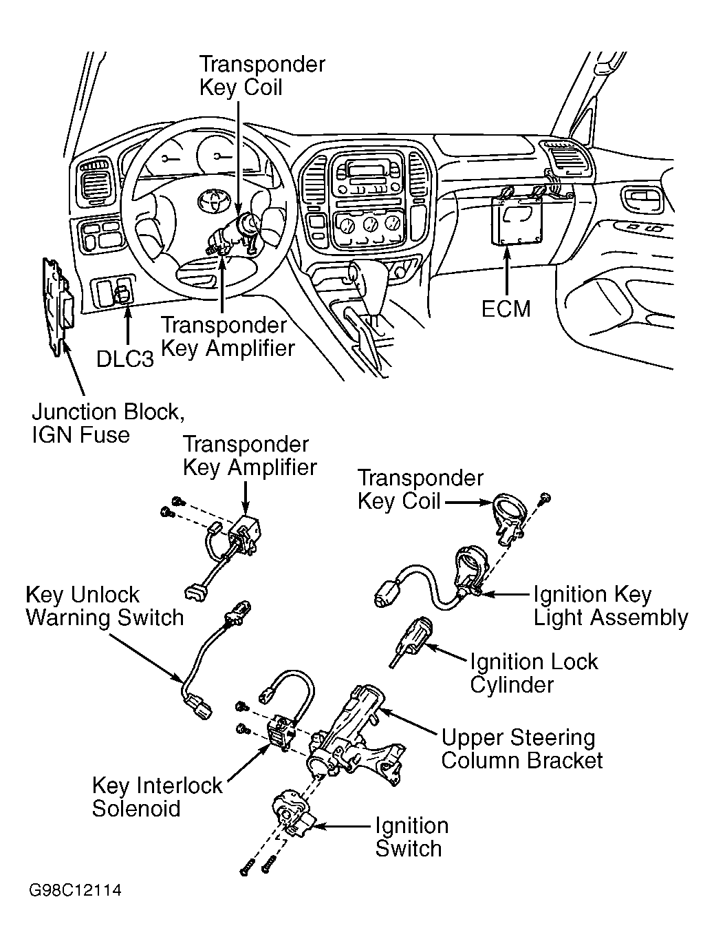 The engine immobilizer system consists of an Engine Control Module (ECM), transponder key coil, transponder key amplifier and key with built-in transponder chip. See Fig 1. When ignition key is inserted in ignition, the transponder chip in the key transmits an electronic code to the transponder key coil. The signal is amplified, and read by the ECM. The engine will start only when the key code is the same as the code registered in the ECM. System is reset each time key is removed from ignition switch.