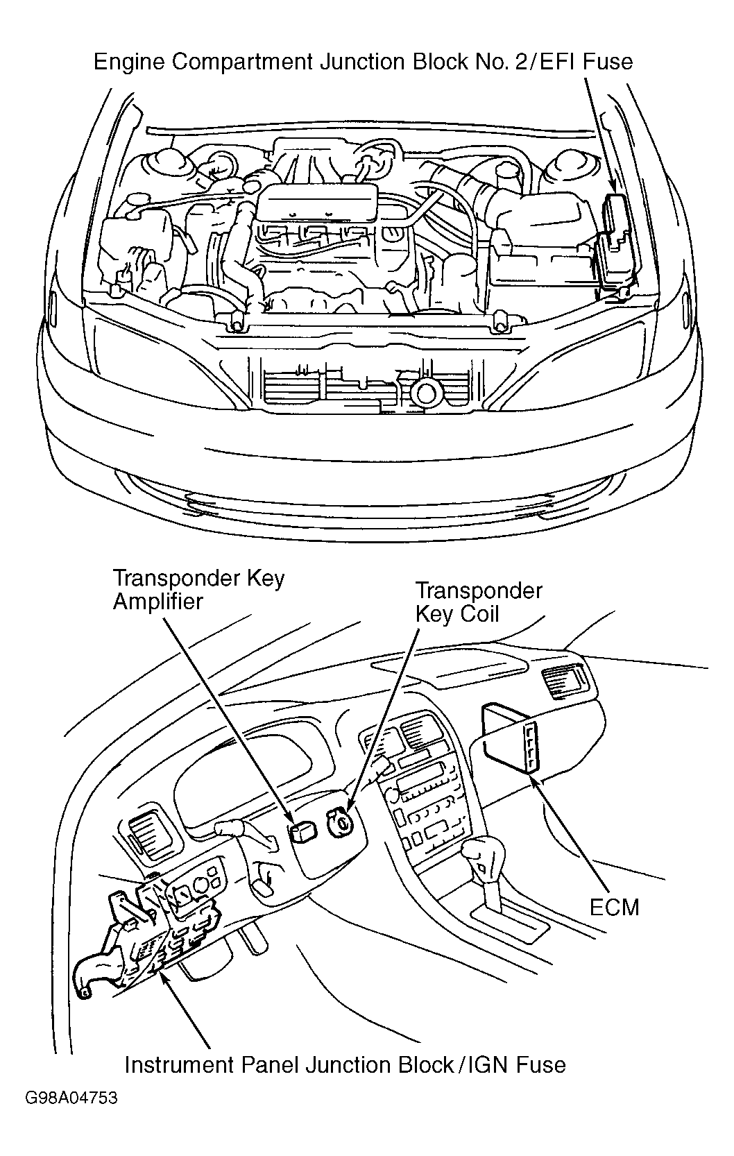 The engine immobilizer system consists of an Engine Control Module (ECM), transponder key coil, transponder key amplifier and key with built-in transponder chip. See Fig 1. When ignition key is inserted in ignition, the transponder chip in the key transmits an electronic code to the transponder key coil. The signal is amplified, and read by the ECM. The engine will start only when the key code is the same as the code registered in the ECM. System is reset each time key is removed from ignition switch.