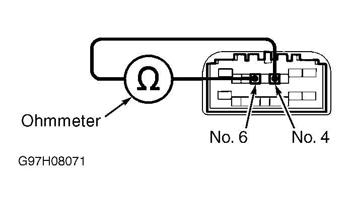 2. Turn ignition off. Disconnect 18-pin tilt and power telescopic unit (combination switch) harness connector. Measure resistance between terminal No. 4 (Red/White wire) with voltmeter positive lead and by backprobing rear of terminal No. 6 (Violet wire) with negative lead at tilt and power telescopic unit (combination switch) harness connector. See Fig 1. Operate manual switch in each position and note resistance reading. See MANUAL SWITCH RESISTANCE  table. If resistance is as specified, go to next step. If resistance is not as specified, replace tilt and power telescopic unit (combination switch) and retest system operation.
