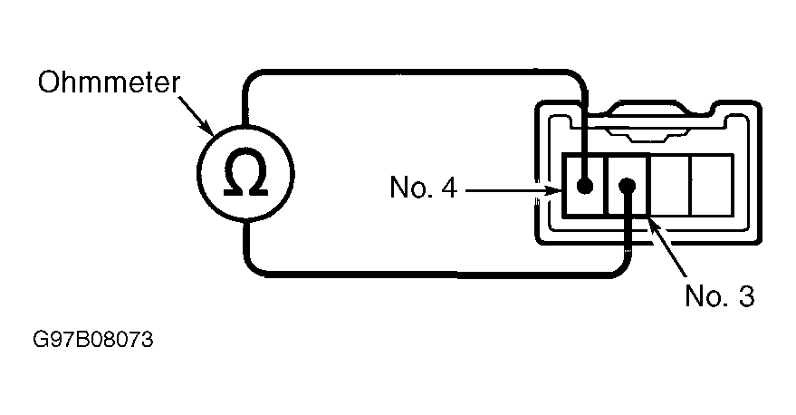 2. Turn ignition off. Disconnect 4-pin driving position memory and return switch harness connector. Using an ohmmeter, measure resistance between driving position memory and return switch harness connector terminals No. 4 (Red/Yellow wire) and No. 3 (Brown/Black wire). See Fig 1. If resistance is one megohm or more with memory set switch off and continuity exists with memory set switch on, go to next step. If resistance is not as specified, replace driving position memory and return switch and retest system operation.