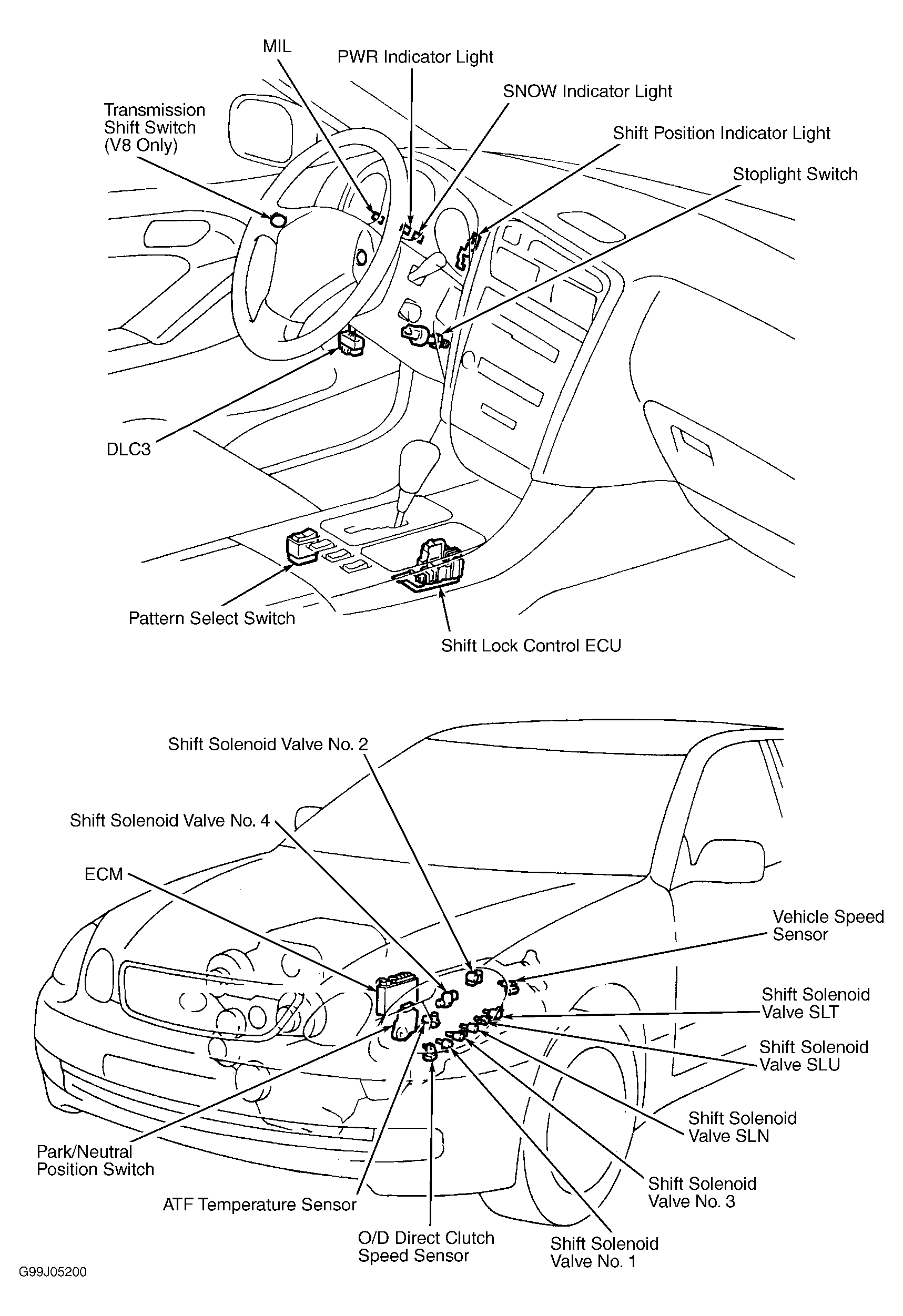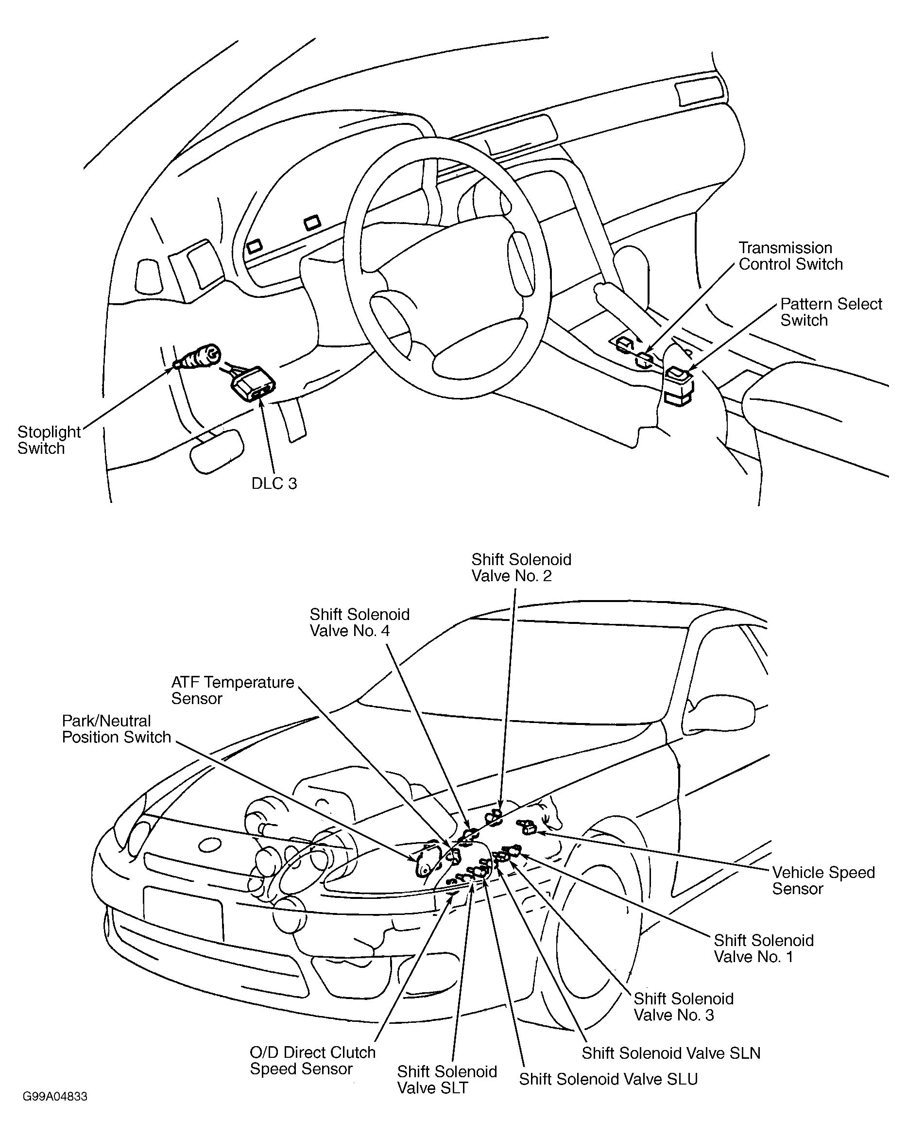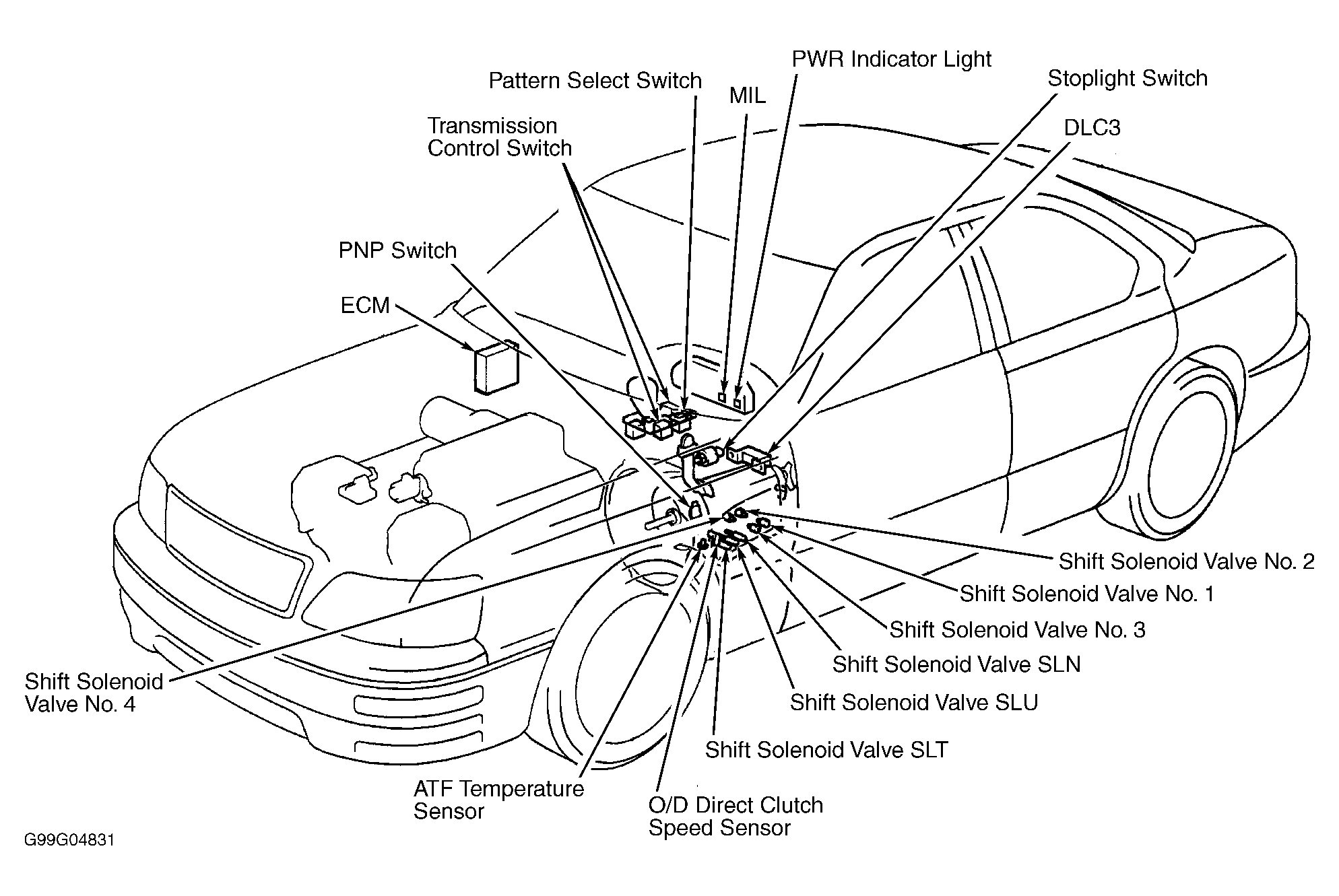 Pattern select switch delivers an input signal to ECM to indicate transmission shift points selected by vehicle operator. Pattern select switch is located near selector lever on center console. See Figure, Figure or Figure