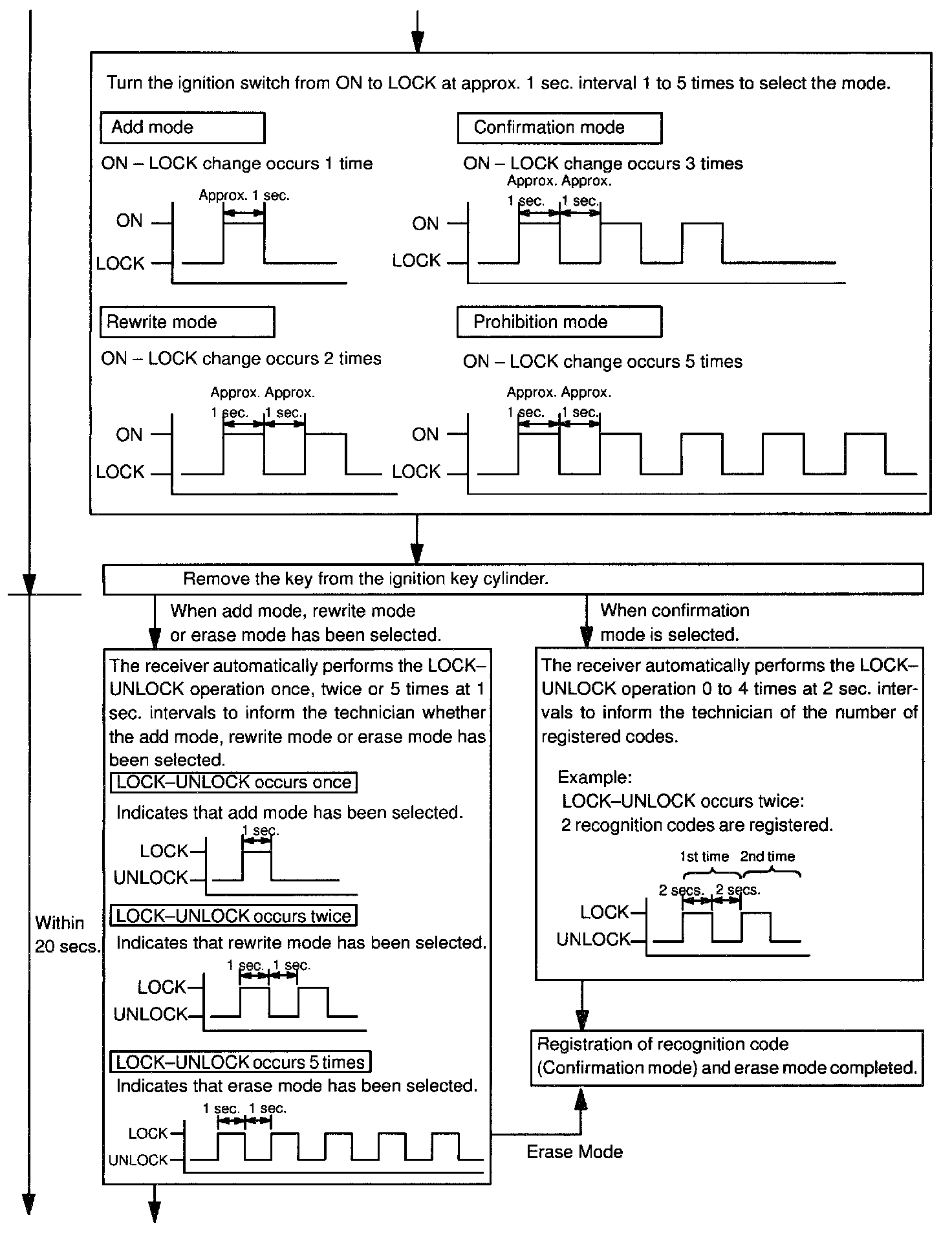 - The add mode is used to retain codes already registered while you register new recognition codes. This mode is used when adding a transmitter. However, if the number of registered codes exceeds 4 codes, previously registered codes are correspondingly erased in order, starting from the first registered code.