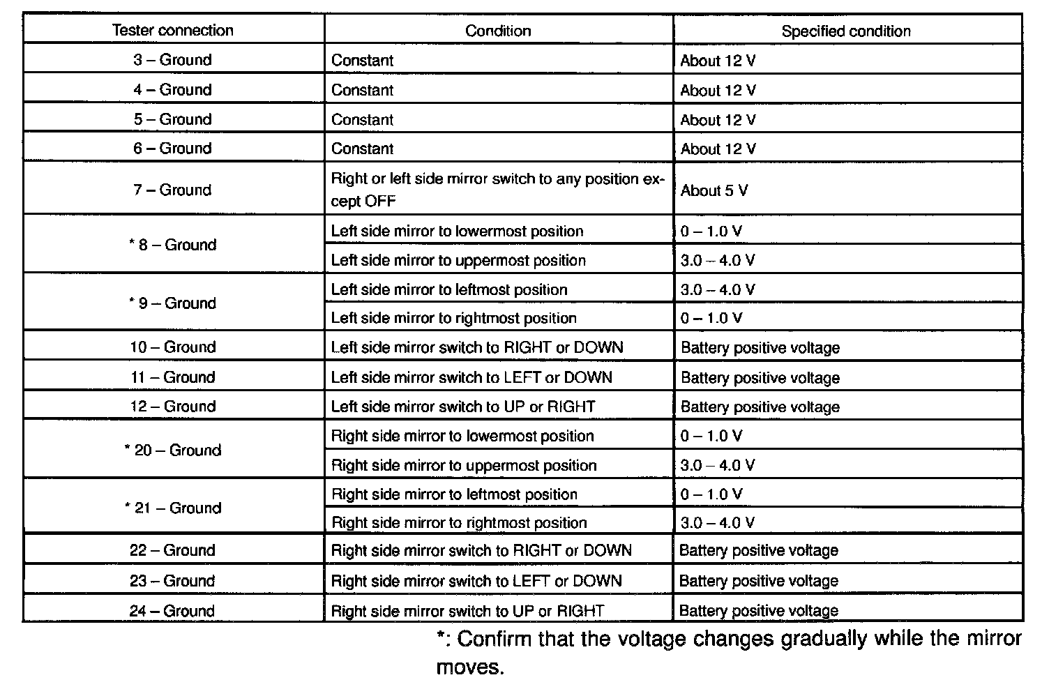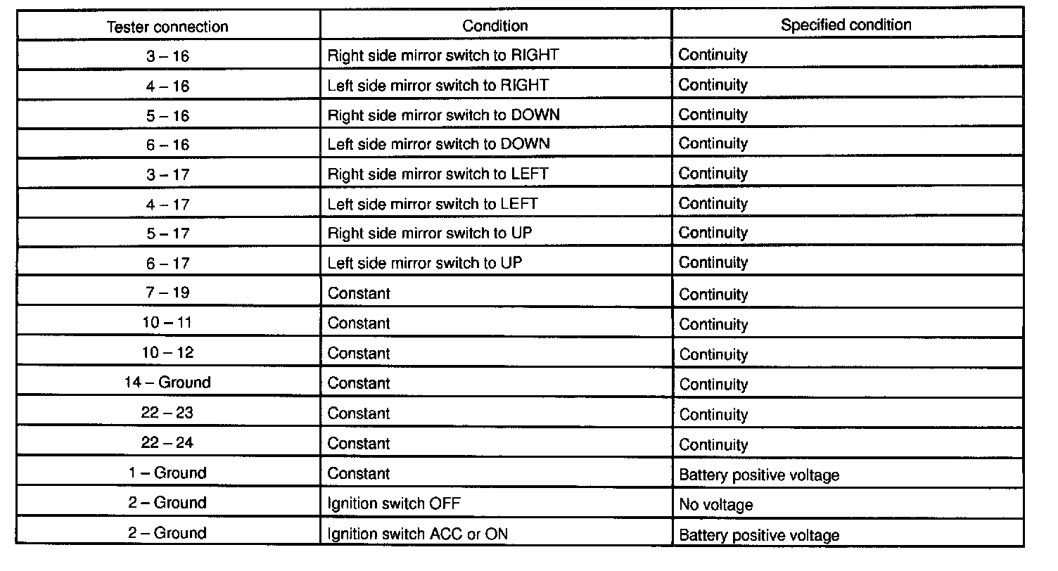 If the operation is not as specified, inspect the wire harness and mirror switch or motor assembly. Then if these are correct, replace the ECU.