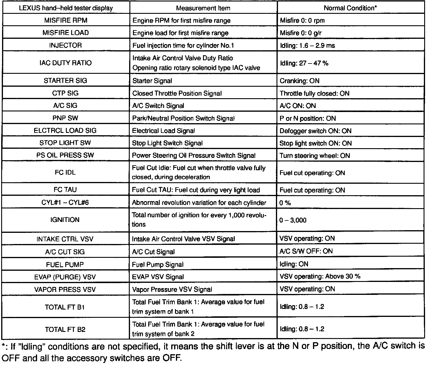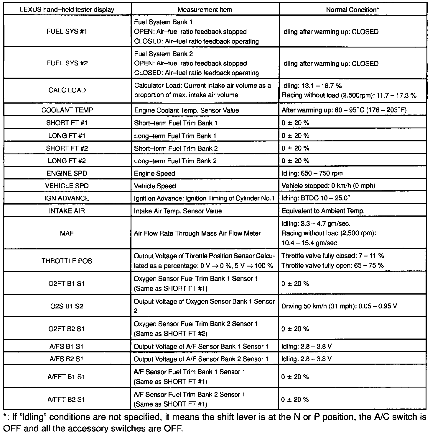 NORMAL ENGINE OPERATING CONDITIONNOTE: The values given below for "Normal Condition" are representative values, so a vehicle may still be normal even if its value differ from those listed here. So do not depend solely on the "Normal Condition" here when deciding whether the part is faulty or not.