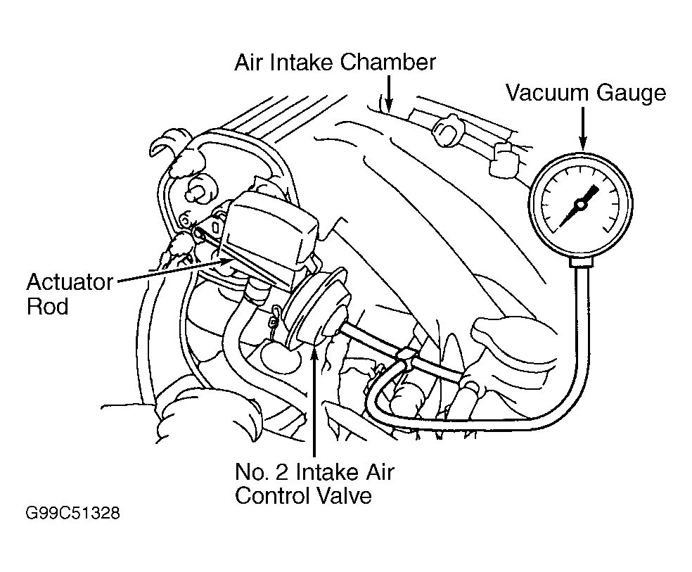 - Locate ACIS Intake Air Control Valve (IACV) to be tested. No. 1 IACV is located between the air intake chamber and No. 1 and 2 throttle bodies. See Fig 1. No 2 IACV is located on front of air intake chamber. See Fig 2. Install a 3-way vacuum "T" fitting in vacuum hose between IACV actuator and ACIS Vacuum Switch Valve (VSV). Connect a vacuum gauge to vacuum "T" fitting. Start engine. With engine idling, ensure vacuum is not present. See Fig 1 or Fig 2
