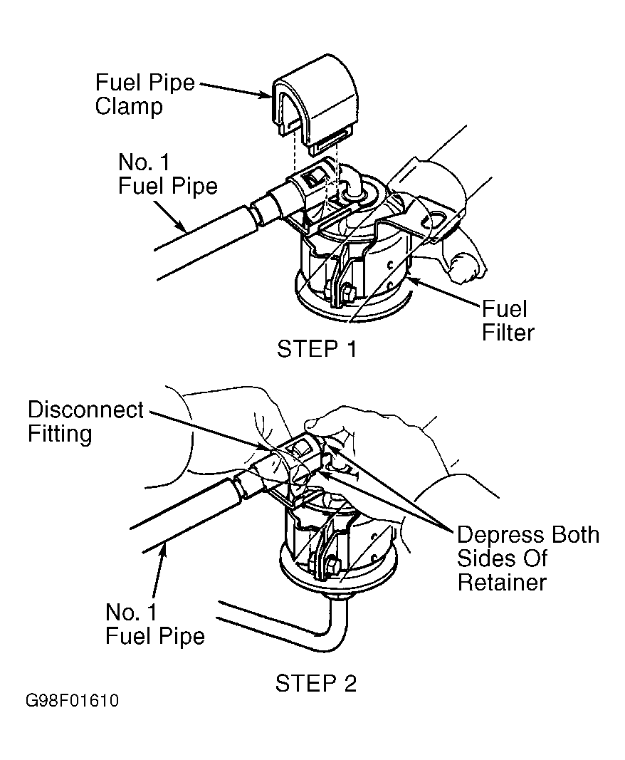 1. Remove fuel injector. See FUEL SYSTEM under REMOVAL, OVERHAUL & INSTALLATION article. Fuel injector is connected to fuel filter for checking fuel injector volume. Remove fuel pipe clamp from No. 1 fuel pipe at fuel filter. Perform STEP 1. See Fig 1. Ensure area around No. 1 fuel pipe and fuel filter is clean. Depress both sides of retainer and pull No. 1 fuel pipe with disconnect fitting from fuel filter. Perform STEP 2. See Fig 1.