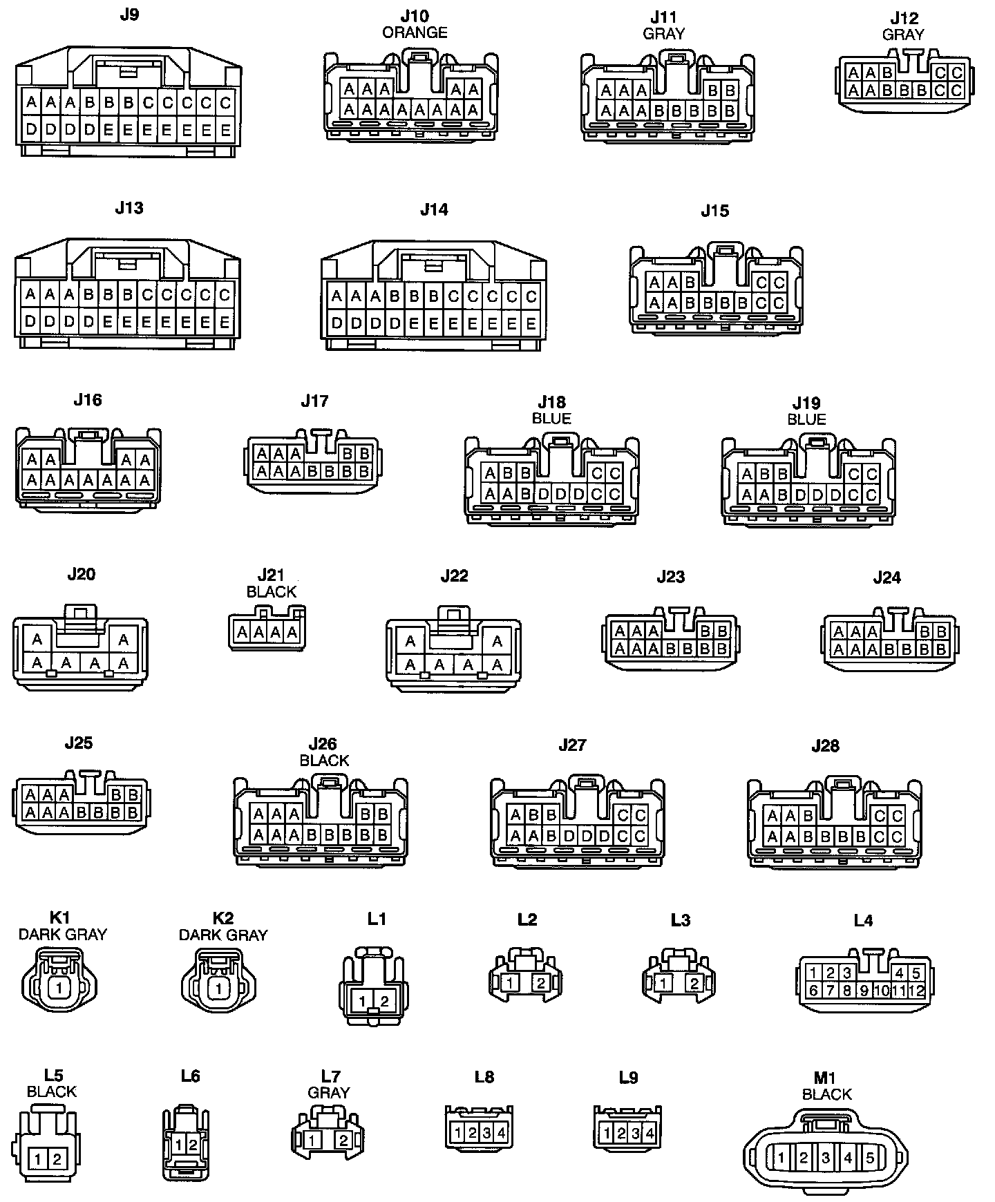Connector Views (J9 - J28, K1 - K2, L1 - L9, M1):