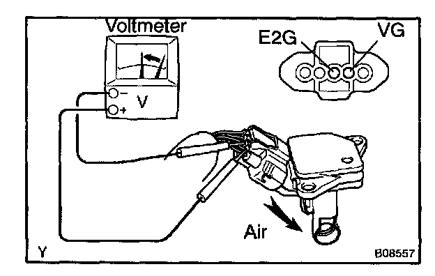 c. Using a voltmeter, connect the positive (+) tester probe to terminal VG and negative (-) tester probe to terminal E2G.