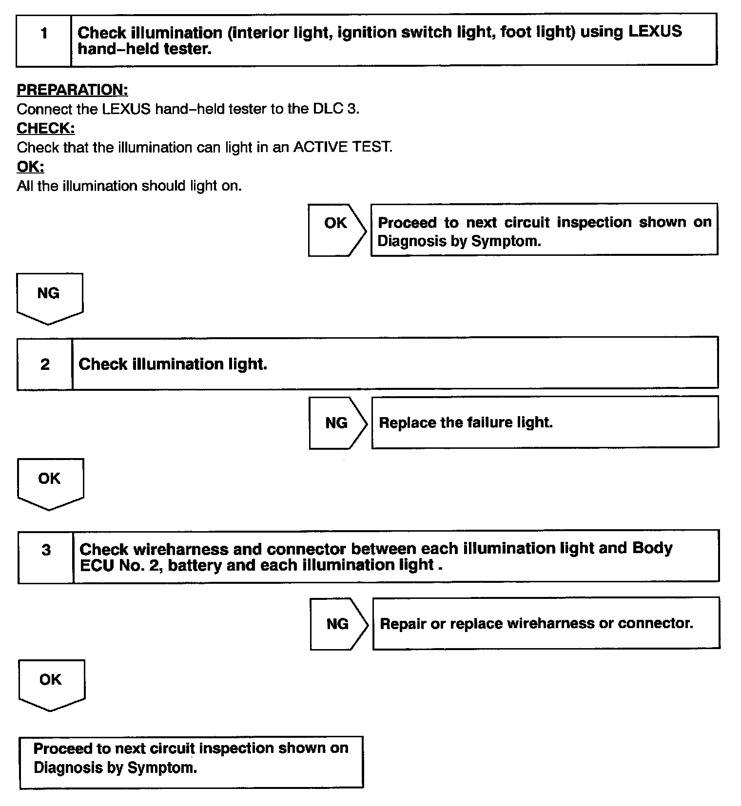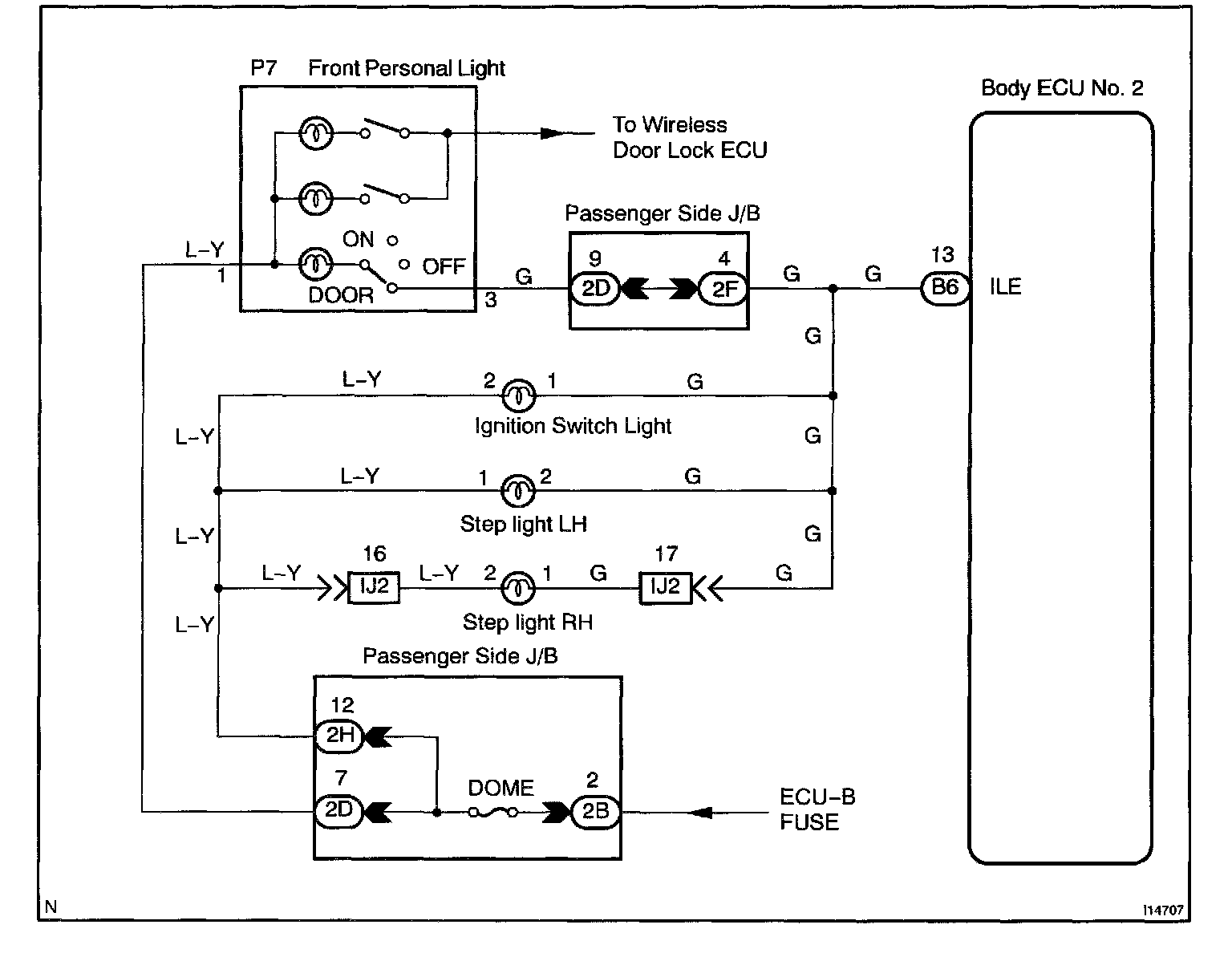Receiving the courtesy signal from either of the door ECU, the Body ECU No.2 will make the interior light, ignition light, and foot light come on.