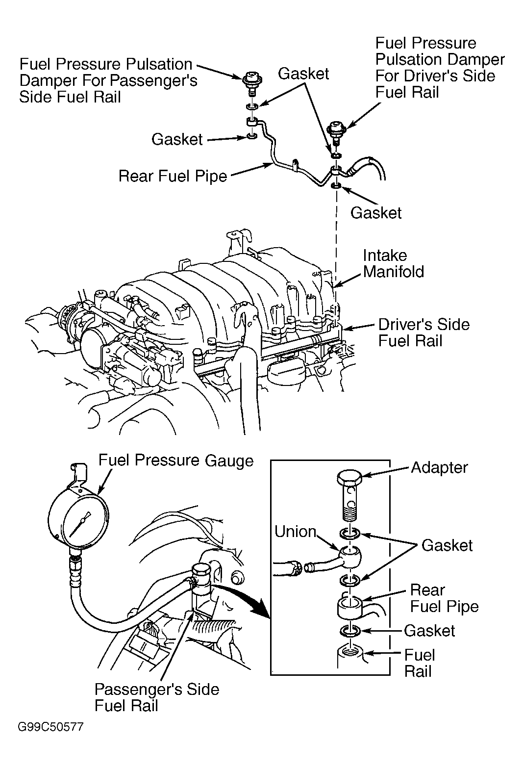 - Release fuel pressure. Disconnect negative battery cable. Remove adapter, union and fuel pressure gauge. Using NEW gaskets, install rear fuel pipe and fuel pressure pulsation damper on passenger's side fuel rail. Tighten fuel pressure pulsation damper to 29 ft. lbs. (39 N.m). Install negative battery cable. Check for fuel leaks by using scan tool to energize fuel pump.