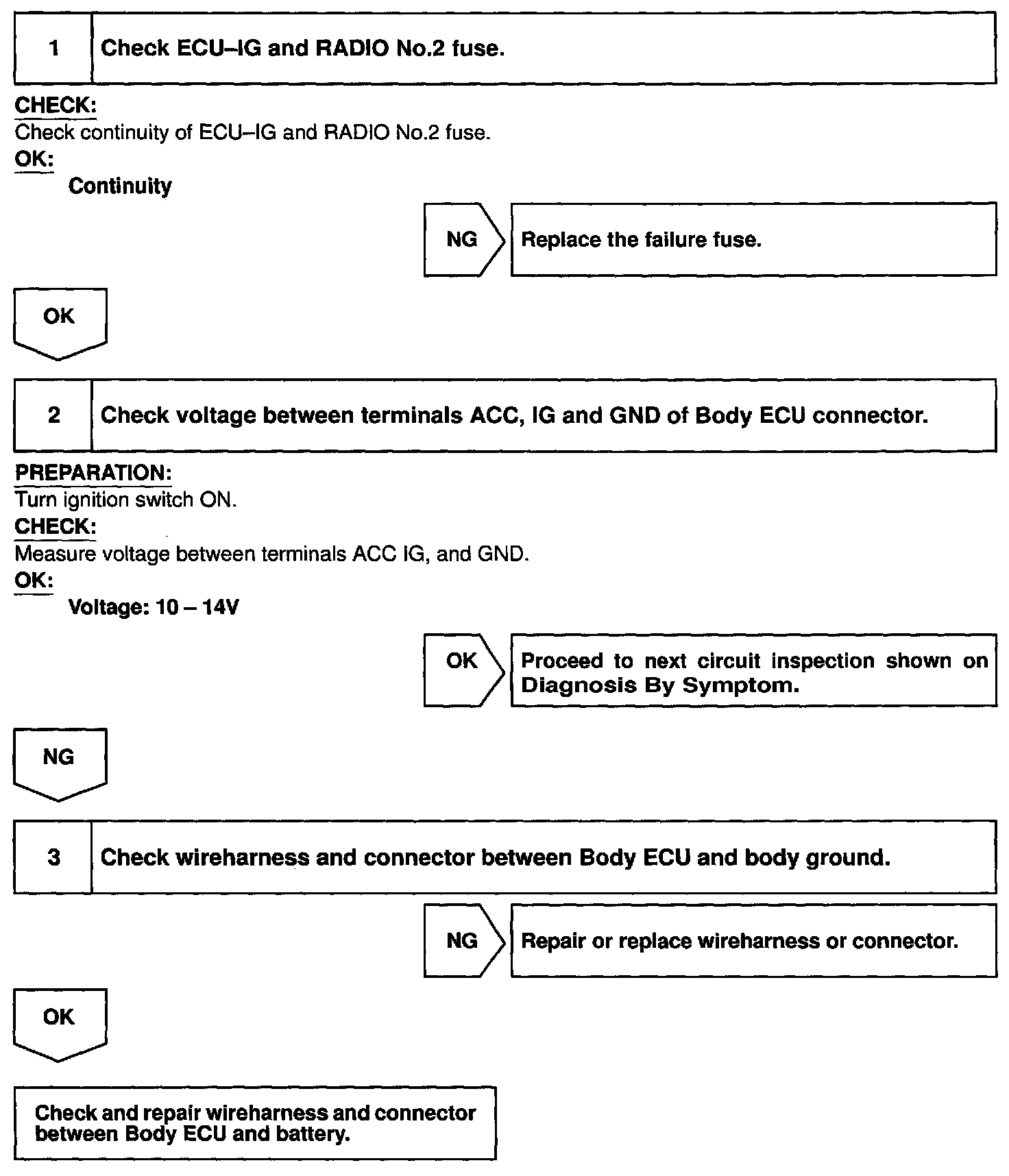 When the ignition switch is turned to the ACC position, battery positive voltage is applied to the terminal ACC of the ECU and when the ignition switch is turned to the ON position, battery positive voltage is applied to the terminal IG of the ECU.