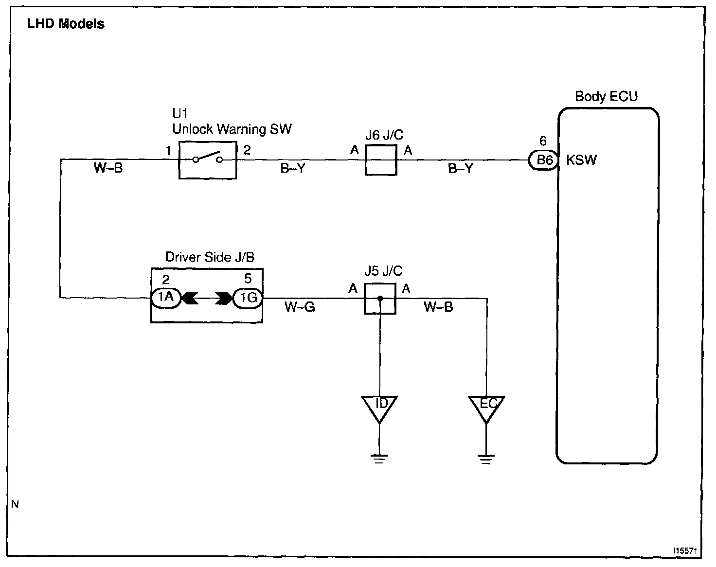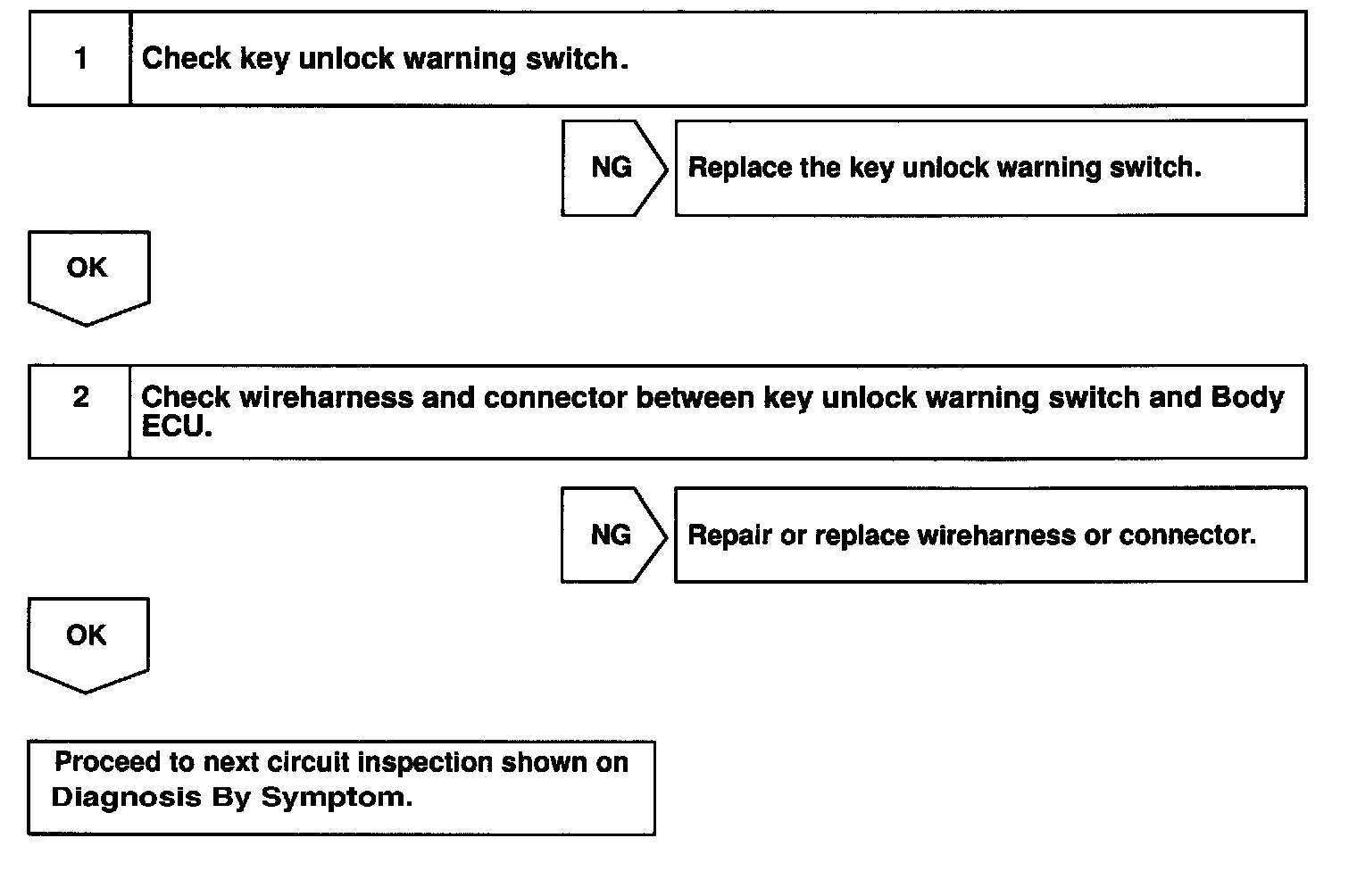 Home >> Lexus >> 2001 >> IS 300 L6-3.0L (2JZ-GE) >> Repair and Diagnosis >> Powertrain Management >> Computers and Control Systems >> Body Control Module >> Testing and Inspection >> Component Tests and General Diagnostics >> Key Unlock Warning Switch Circuit