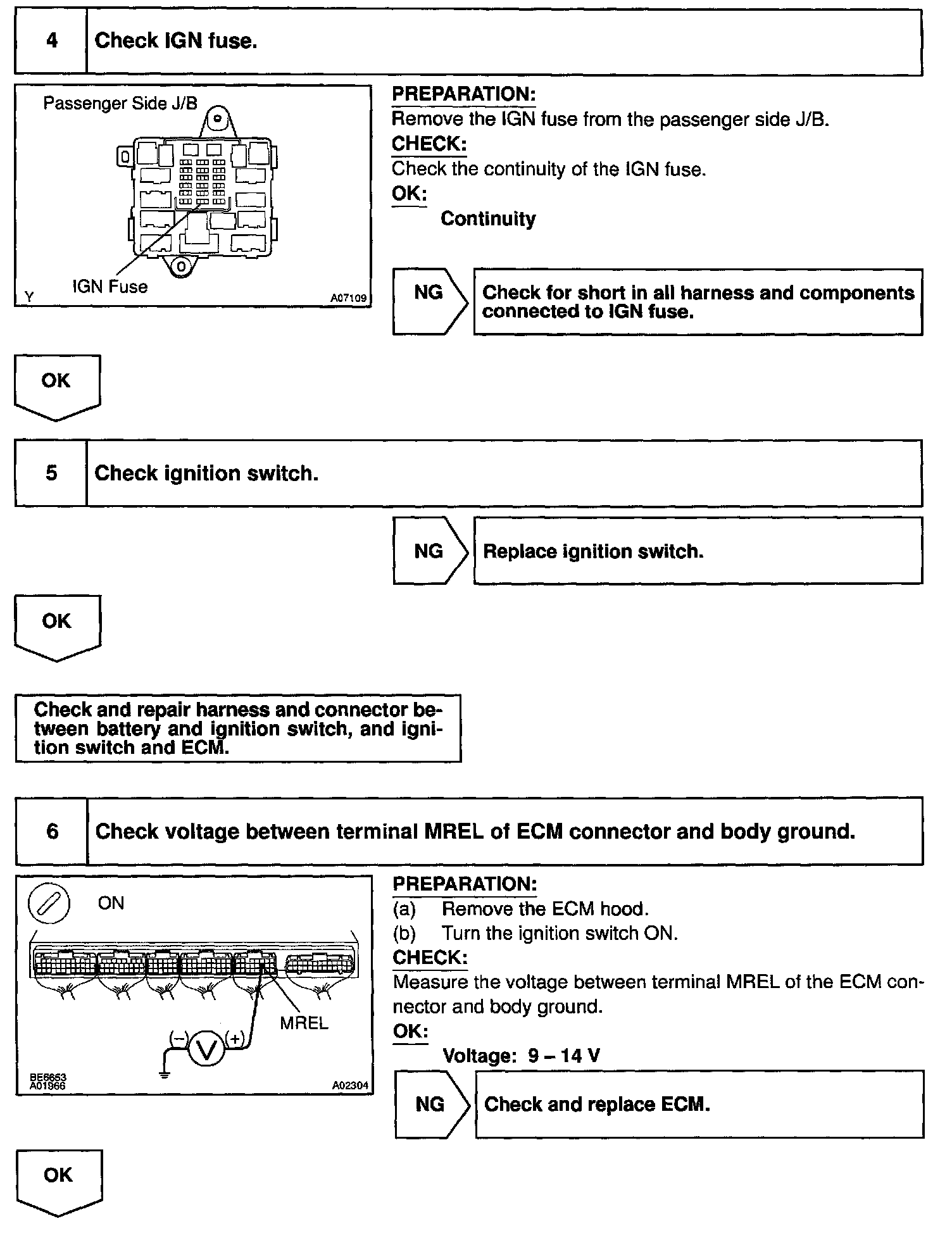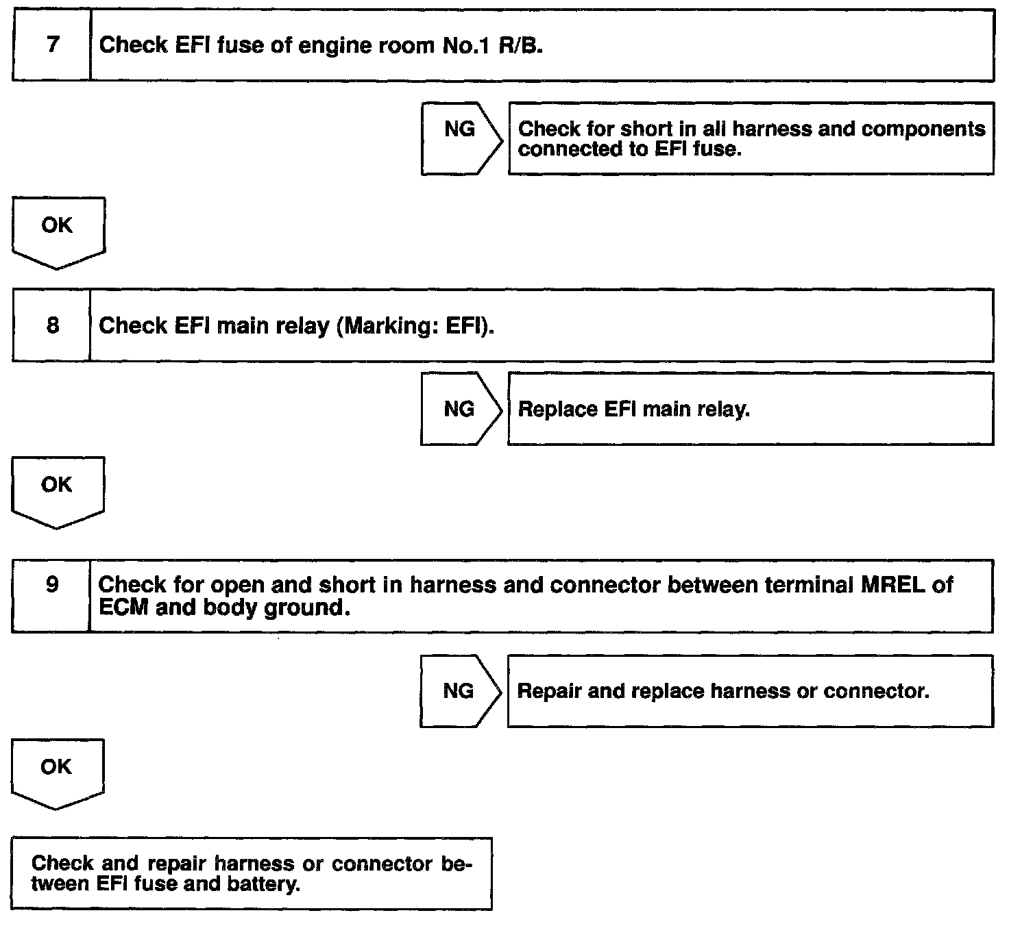 When the ignition switch is turned ON, battery positive voltage is applied to terminal IGSW of the ECM and the EFI main relay (Marking: EFI) control circuit in the ECM sends a signal to terminal MREL of the ECM switching on the EFI main relay.