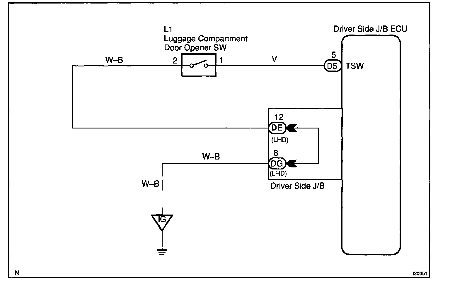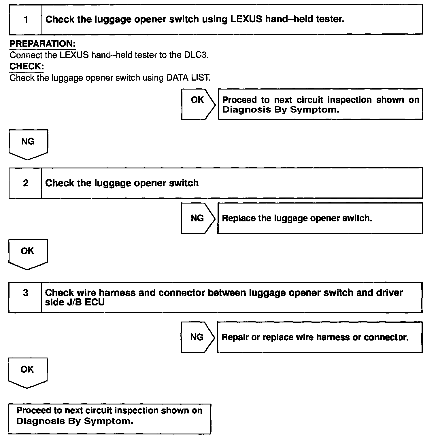 Home >> Lexus >> 2001 >> LS 430 V8-4.3L (3UZ-FE) >> Repair and Diagnosis >> Powertrain Management >> Computers and Control Systems >> Body Control Module >> Testing and Inspection >> Component Tests and General Diagnostics >> Body No. 2 Control System >> Luggage Opener Switch Circuit