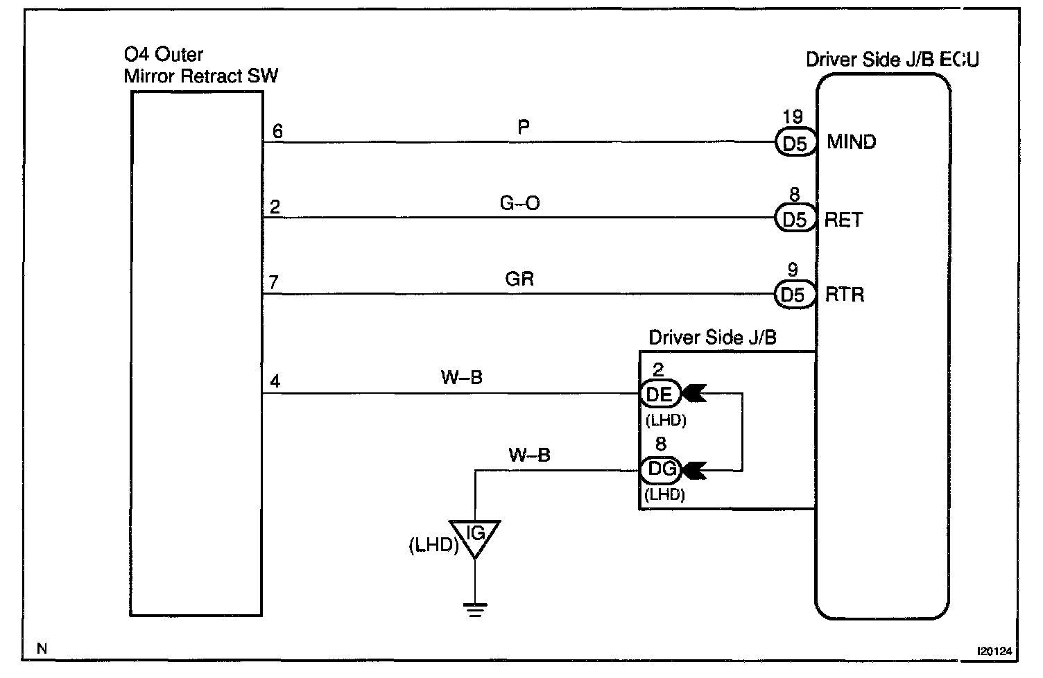The operating condition of the mirror retract switch is input by the driver side J/B ECU and the input signals are sent to the driver door ECU or the passenger door ECU.
