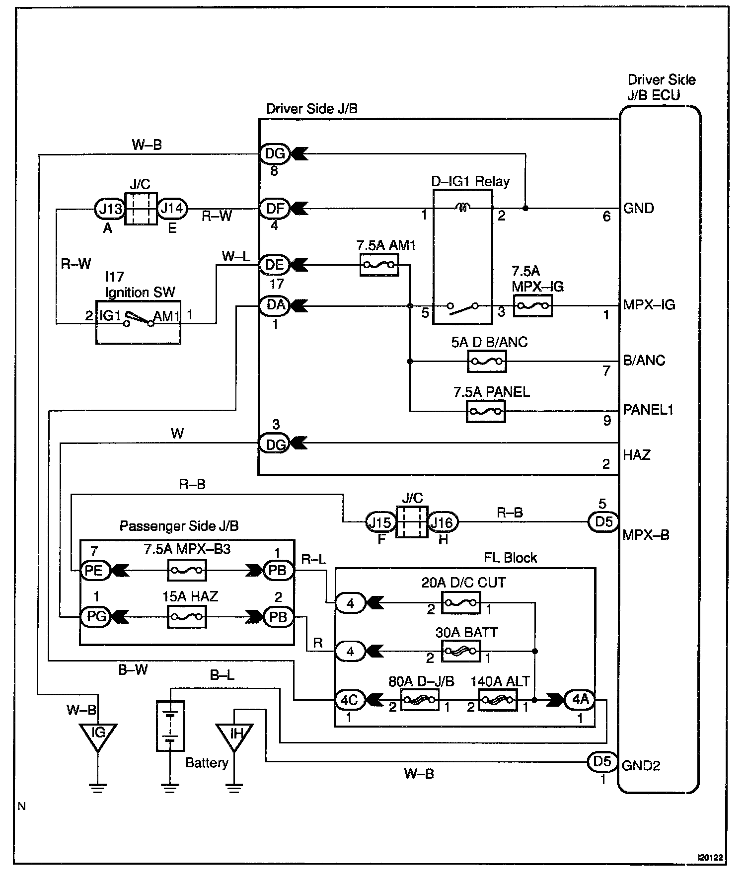 This circuit provides power to operate the Driver side J/B ECU.