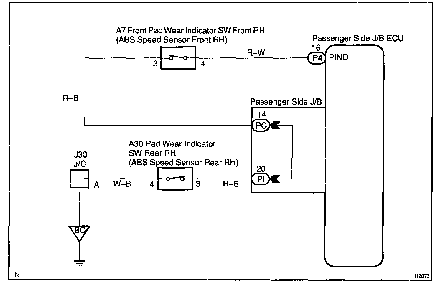 Passenger side J/B ECU receives the brake pad sensor signal and sends it to the Combination meter.