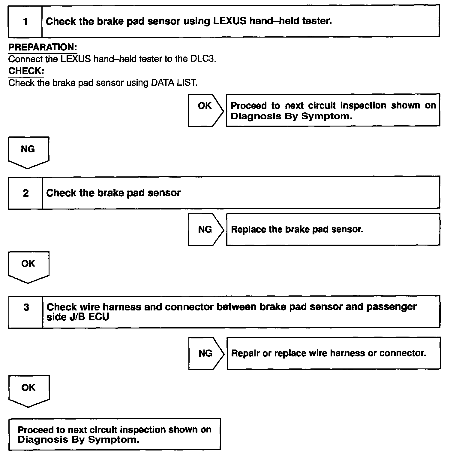 Home >> Lexus >> 2001 >> LS 430 V8-4.3L (3UZ-FE) >> Repair and Diagnosis >> Powertrain Management >> Computers and Control Systems >> Body Control Module >> Testing and Inspection >> Component Tests and General Diagnostics >> Body No. 3 Control System >> Brake Pad Sensor Circuit