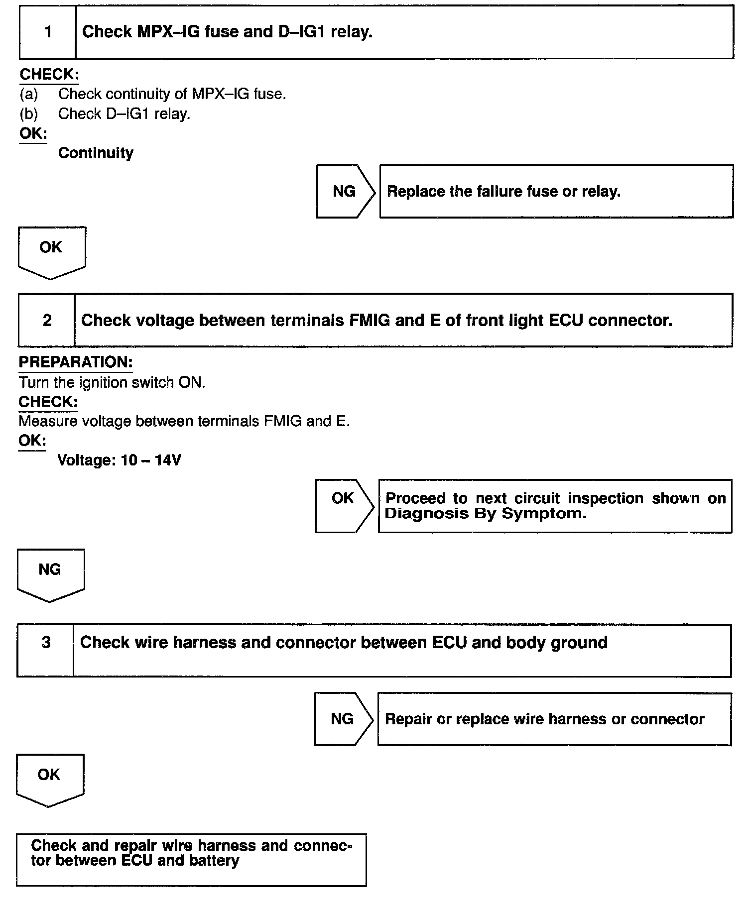 Also, if the ignition switch is turned to the ON position, battery positive voltage is applied to the terminals ACC and IG of the ECU.