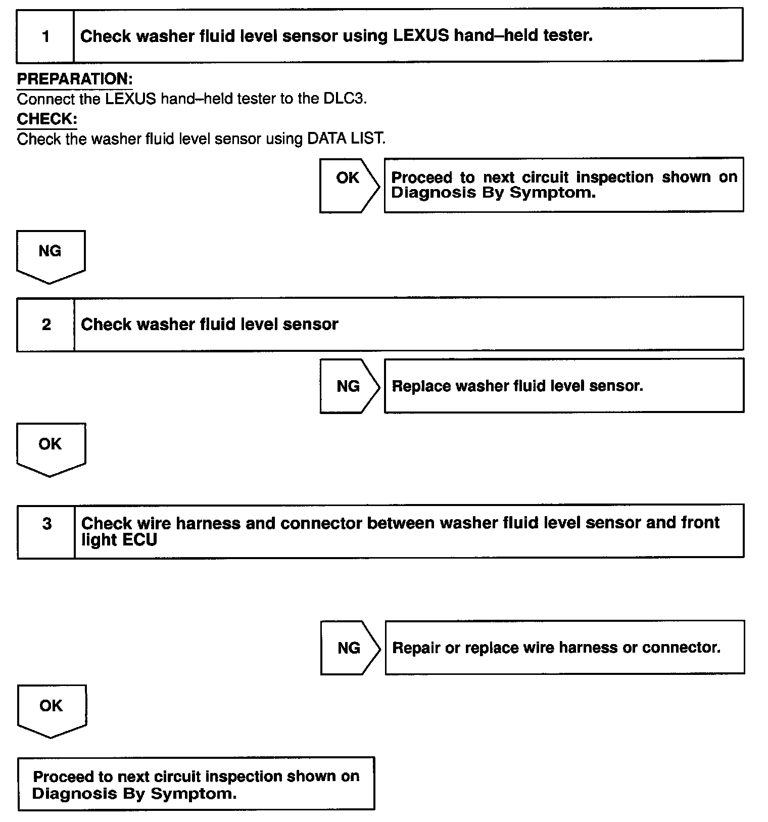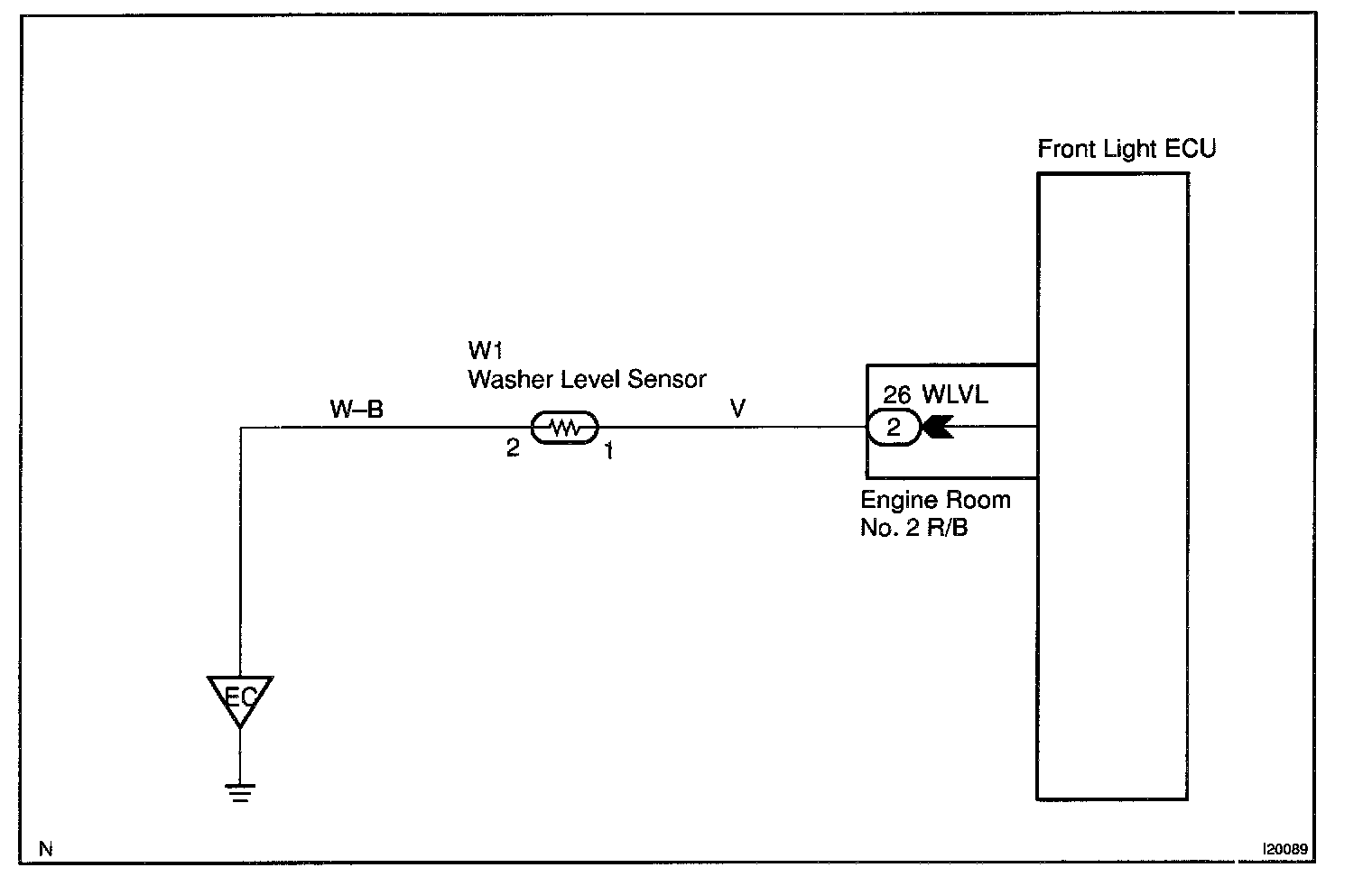 CIRCUIT DESCRIPTIONFront Light ECU receives washer fluid level sensor information, and sends it through the multiplex communication circuit to the combination meter.