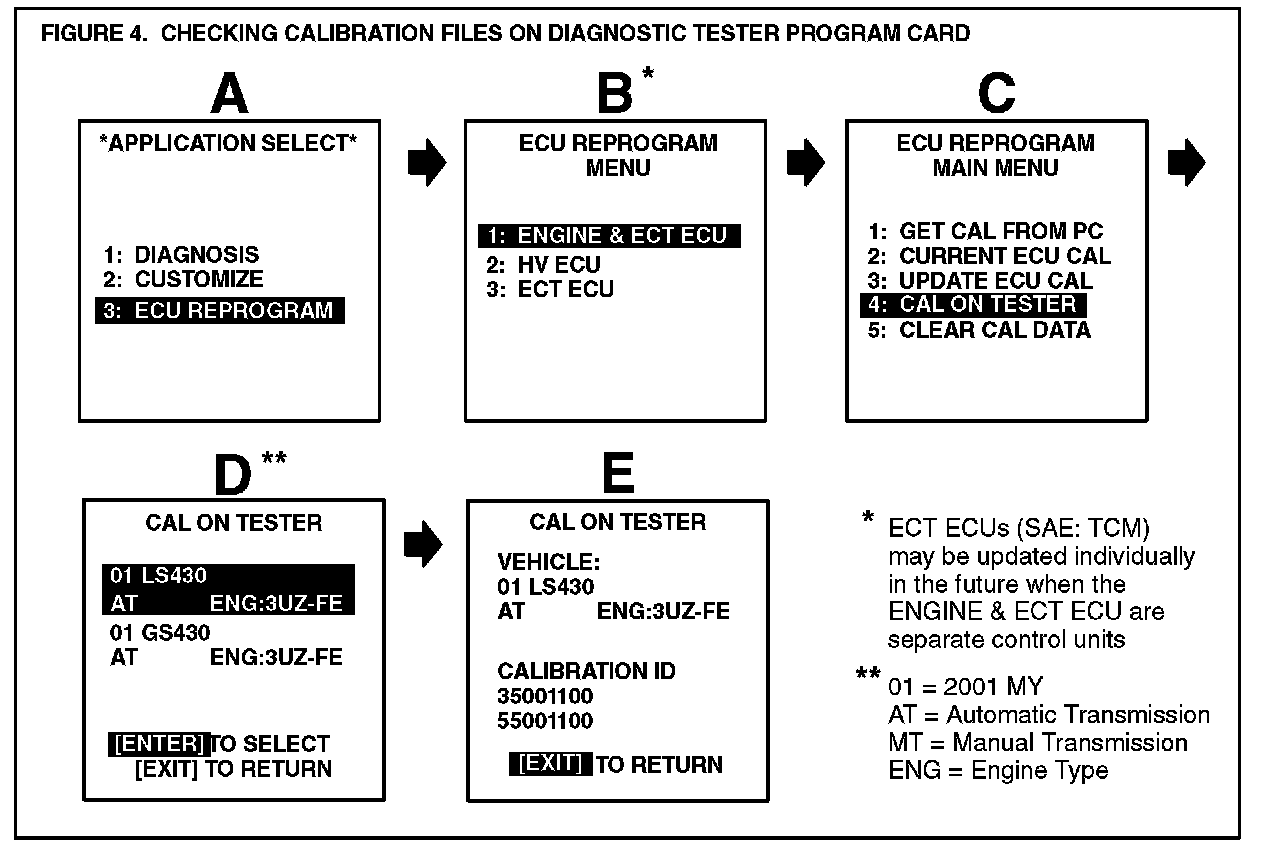 A. Before downloading a new calibration file from TIS, check the current calibration files stored on the Diagnostic Tester Program Card by following the screen flow (Figure 4).