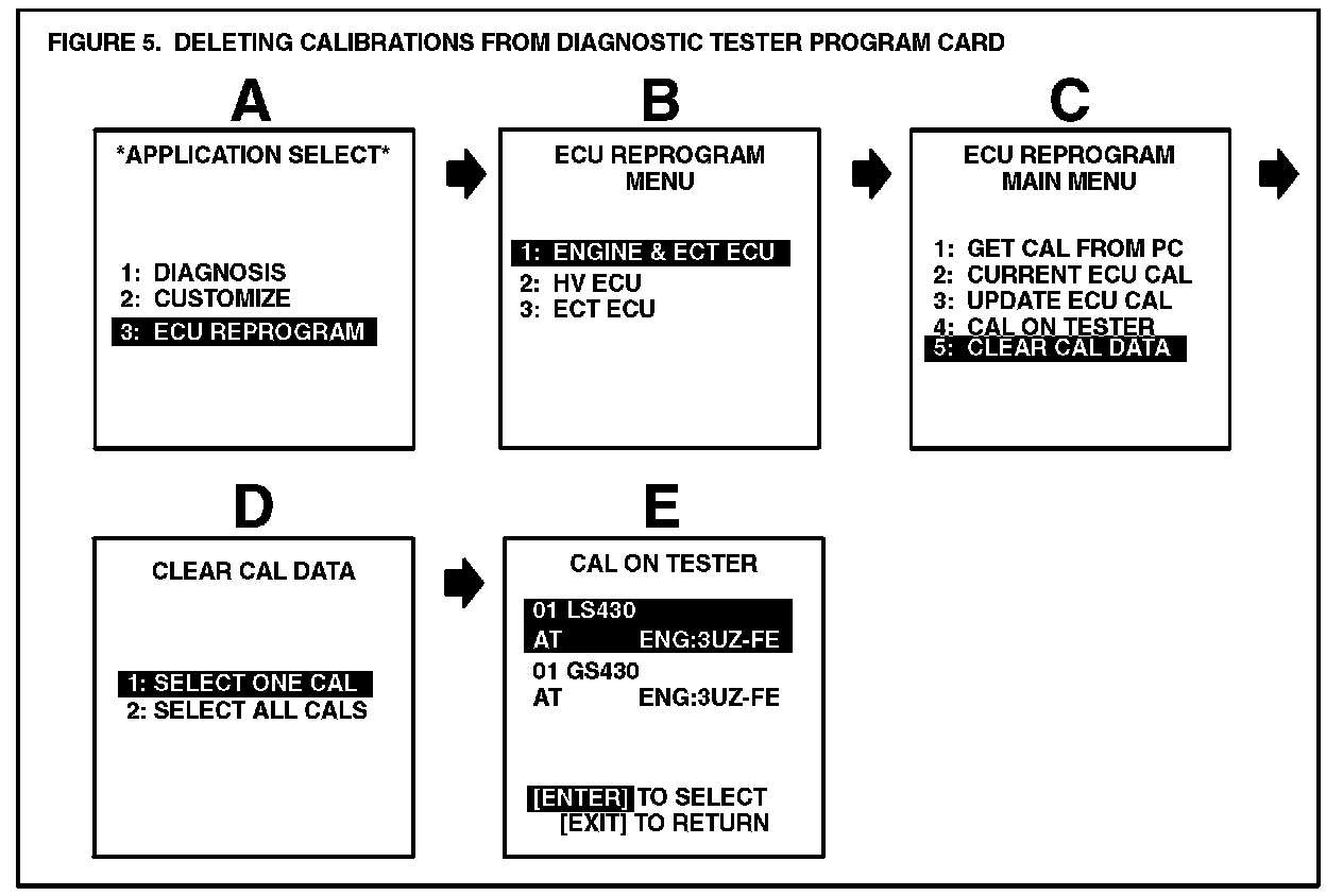 B. You have the option to delete calibrations off the tester before downloading a new calibration. The CUW also provides this option if there is not enough memory for the new calibration. To delete one or all of the calibrations, follow the screen flow below (Figure 5).
