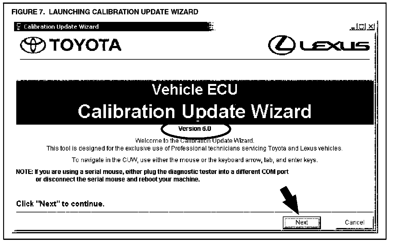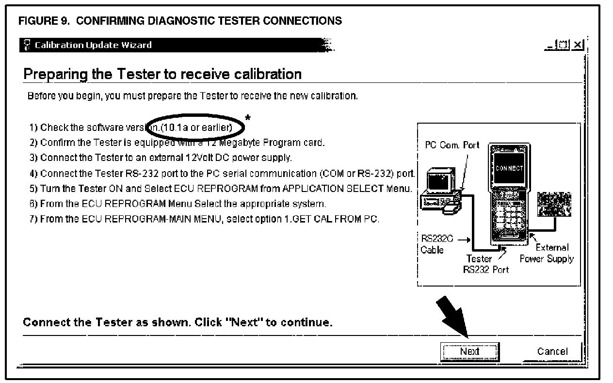 D. The Calibration Update Wizard (CUW) launches automatically when a calibration file link is selected (or clicked). Verify that the CUW version is 6.0 or higher. If not, refer to the Note below. The CUW will guide you through the steps to download the calibration file to the Diagnostic Tester Program Card. Click NEXT on the first screen (Figure 7).