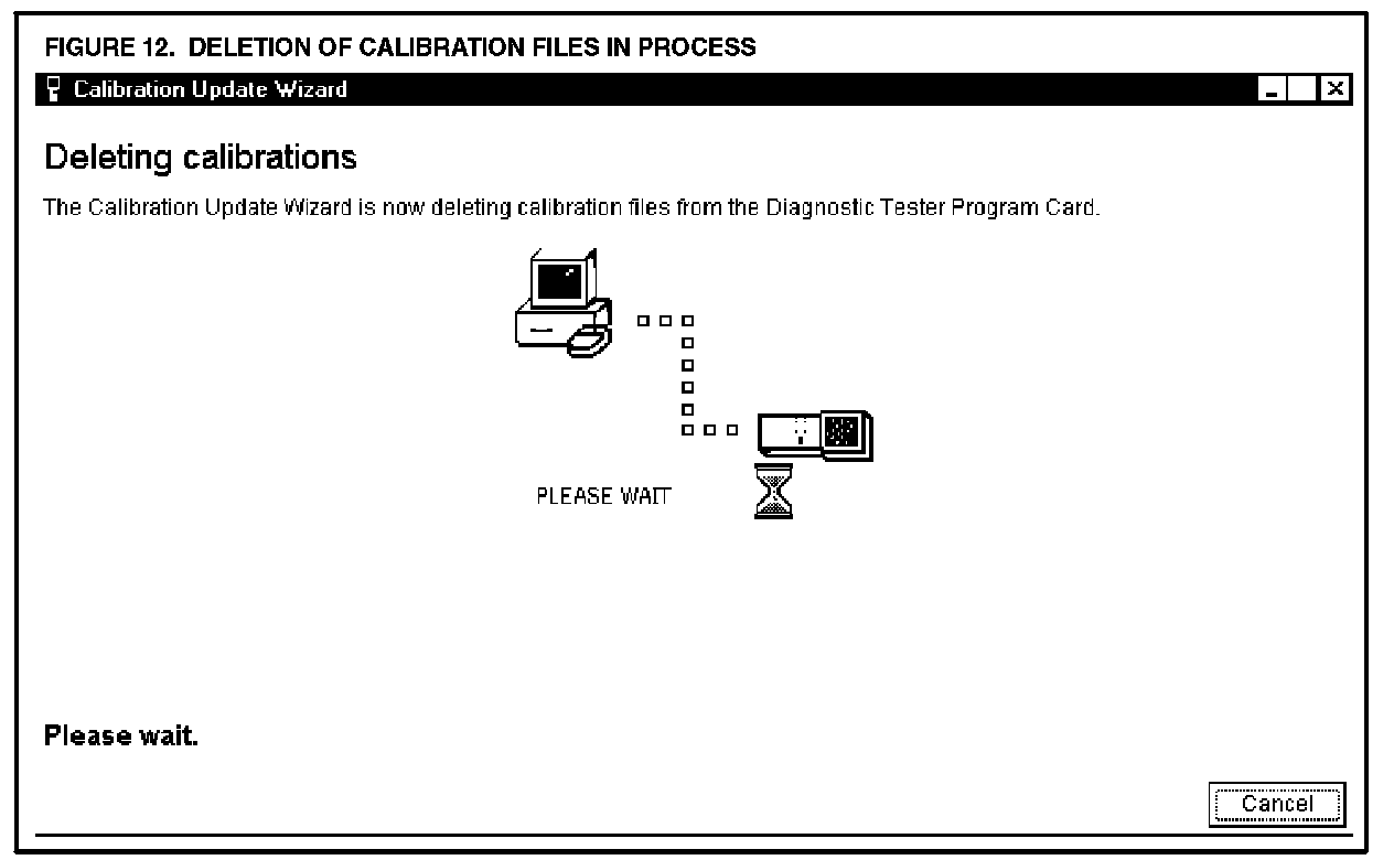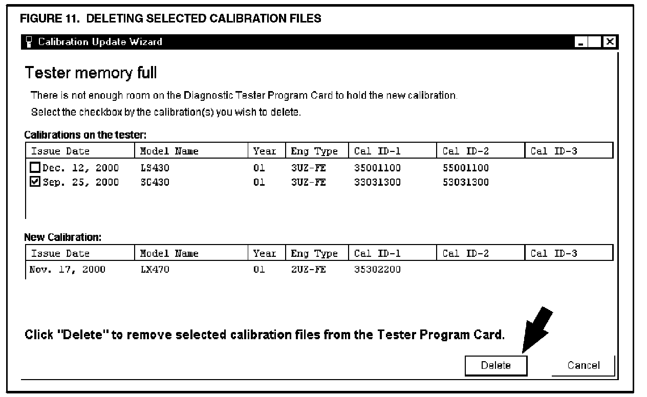 H. The CUW determines if there is enough memory to store the calibration file on the Diagnostic Tester Program Card. If there is insufficient memory, the CUW will ask you to select the calibration file(s) to delete from the Diagnostic Tester Program Card to make room for the new calibration file. If necessary, check the calibration file(s) to delete, as shown in Figure 11. Click DELETE.