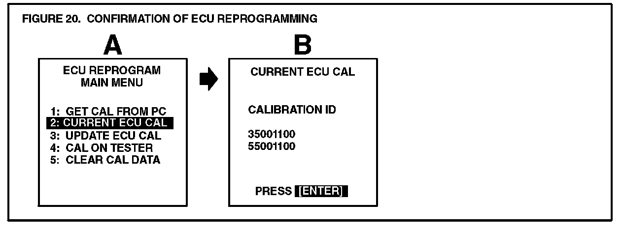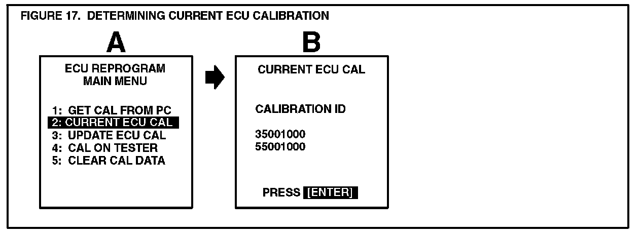 A. Connect the Diagnostic Tester to the vehicle and select CURRENT ECU CAL from the ECU REPROGRAM MAIN MENU. Determine the vehicle's current ECU calibration. (See Figure 17.)