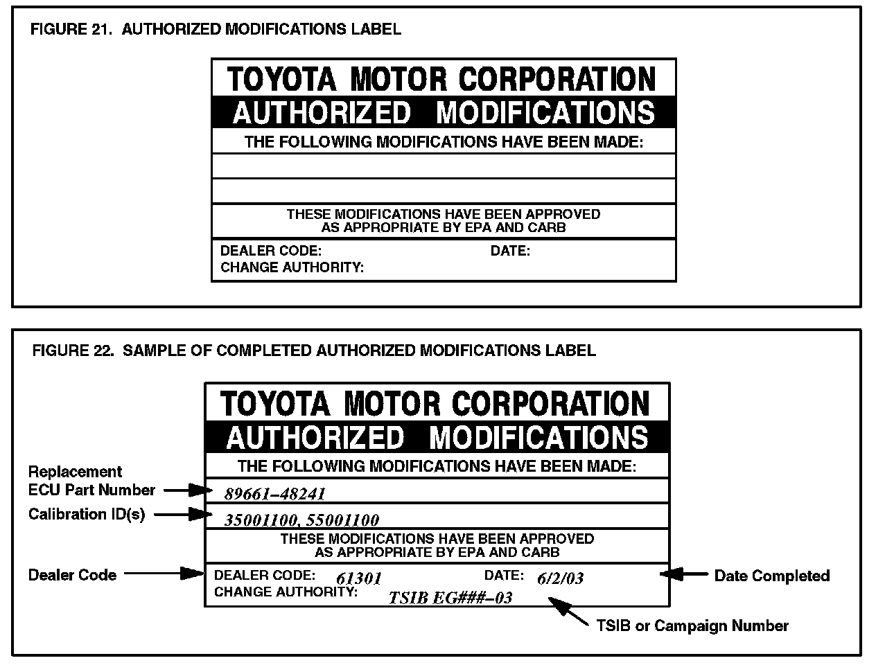 B. Using a permanent marker or ball point pen, enter the required information on the Authorized Modifications Label (Figures 21 and 22).