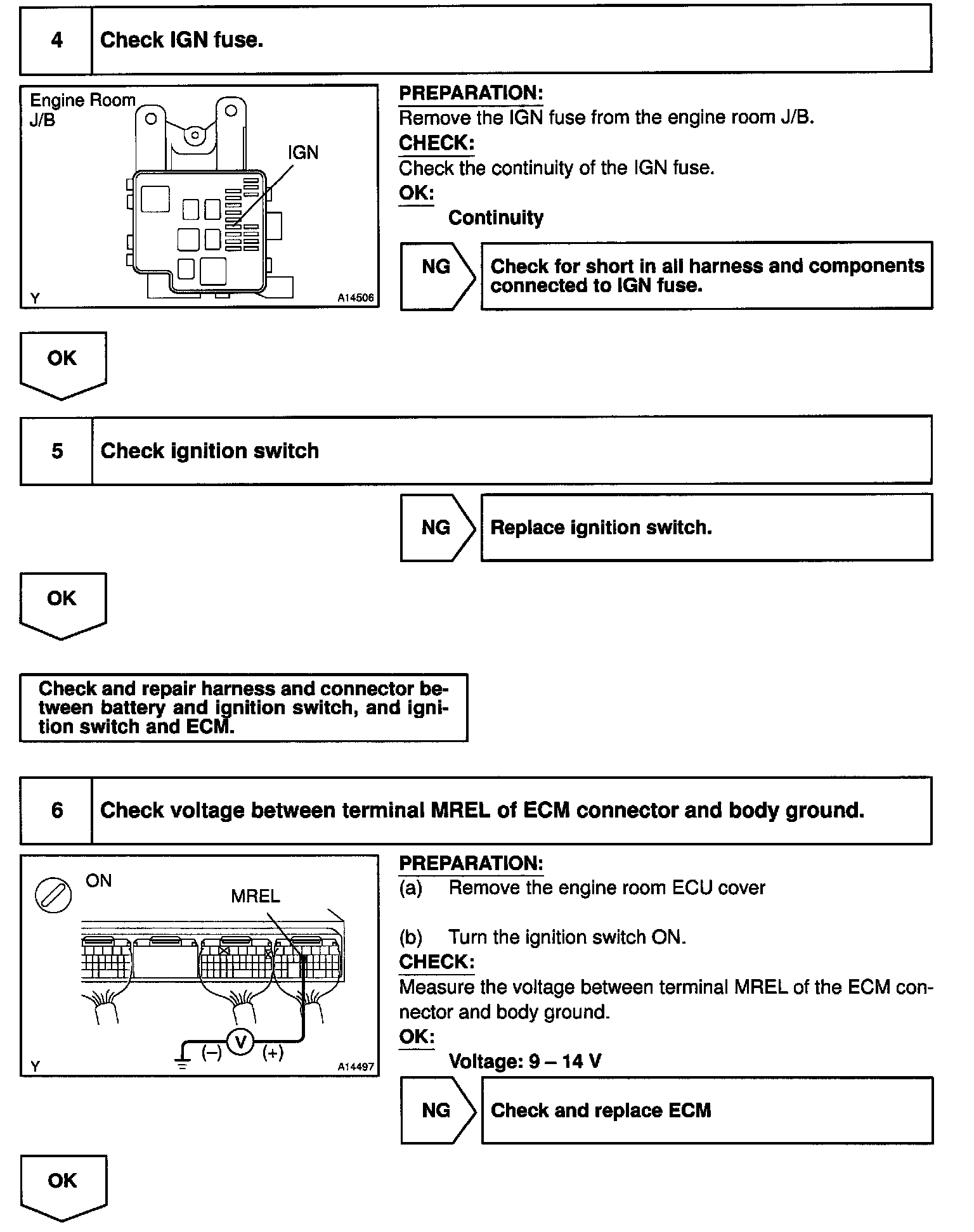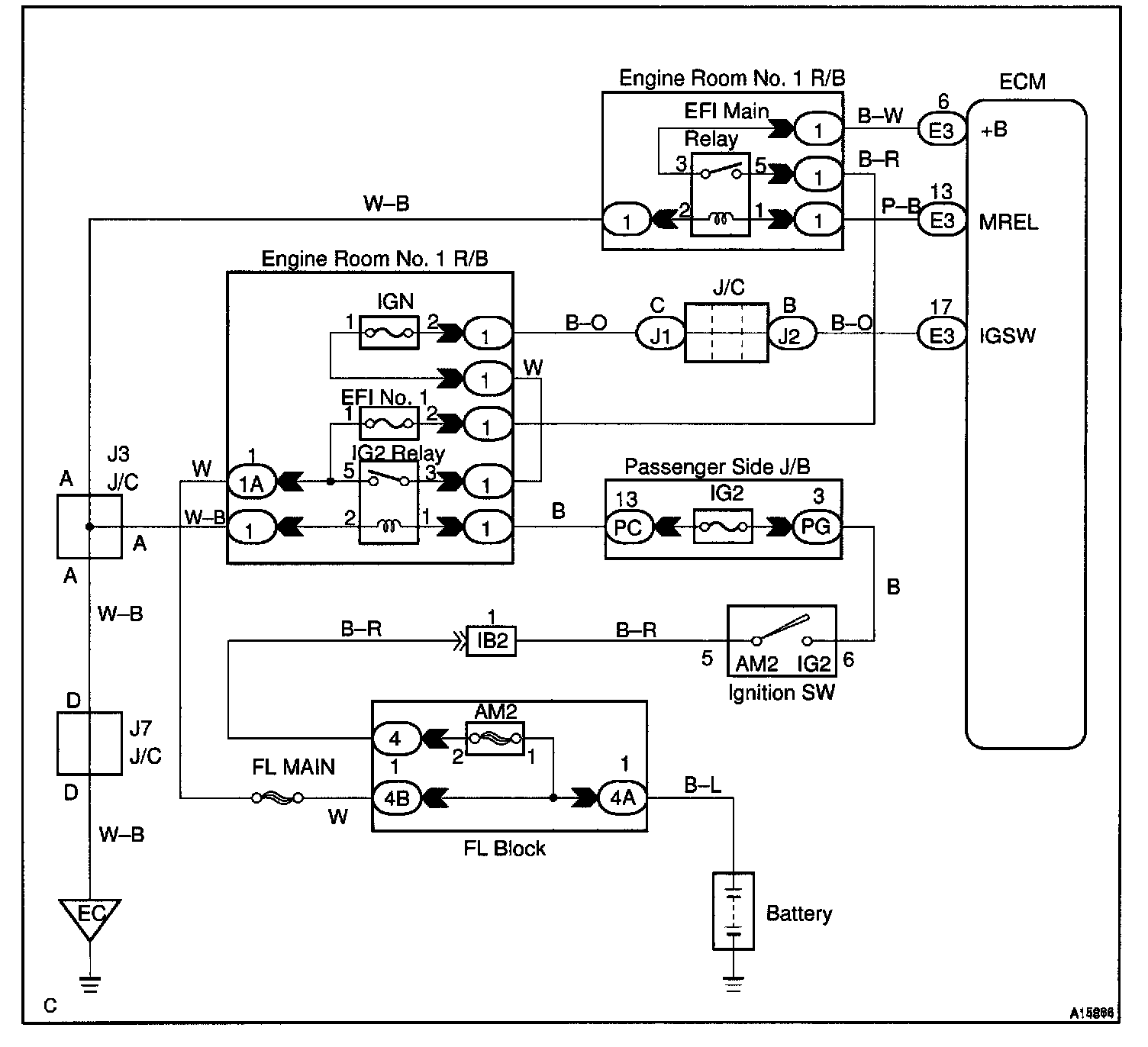 This signal causes current to flow to the coil, closing the contacts of the EFI main relay and supplying power to terminal +B of the ECM.