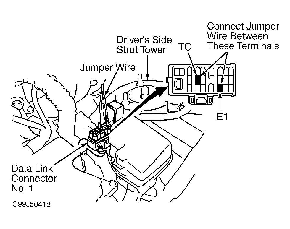 3. Install Jumper Wire (SST 09843-18020) between terminals TC and E1 on DLC1 located near driver's side strut tower. See Figure. Apply parking brake. Place transmission in Neutral. Start engine and allow engine to idle.