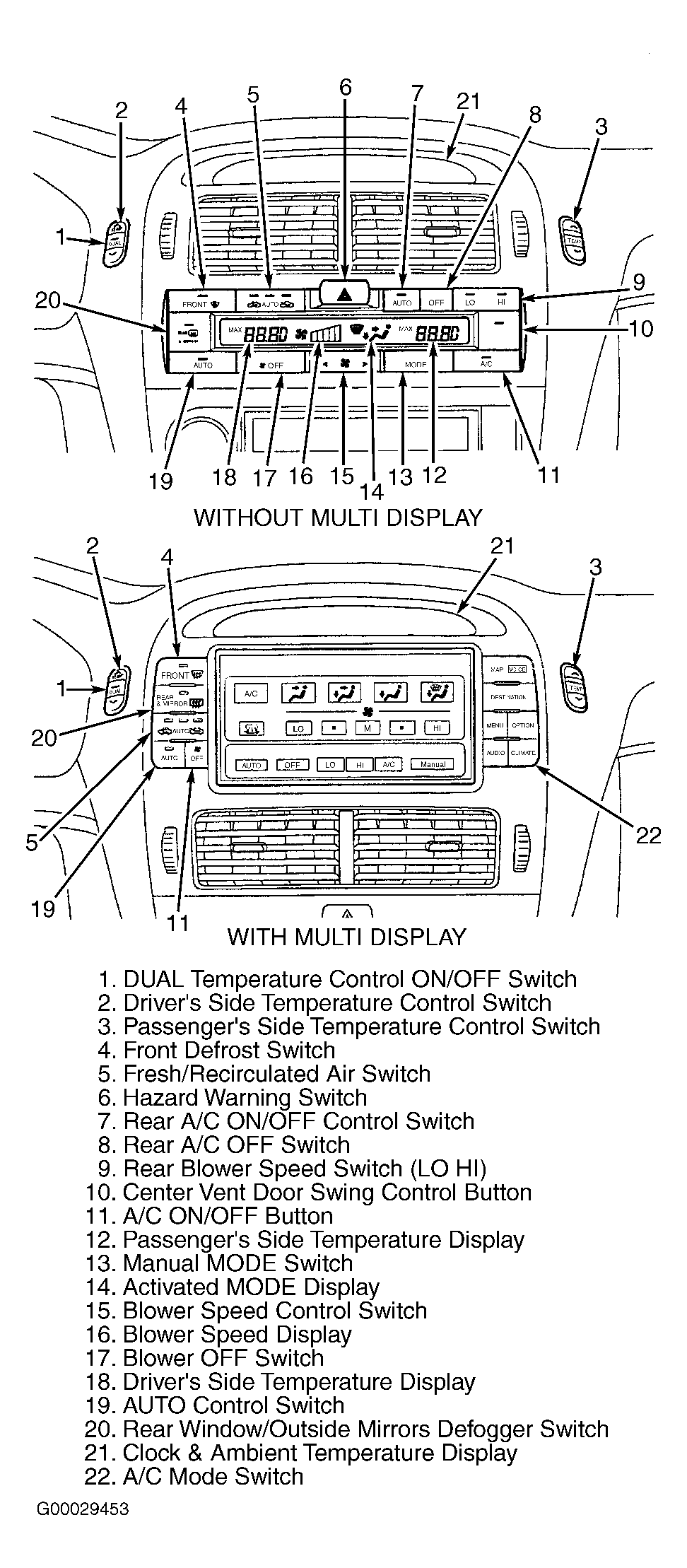 Automatic initializing occurs when battery is reconnected and ignition switch is turned to ON position for the first time. When this occurs, front defrost indicator will blink. See Figure. If mode indication is different from actual air outlet in actuator check, press rear defrost and OFF switches simultaneously, and turn ignition switch to ON or START position. Servomotor initializing will occur and defrost indicator will blink.