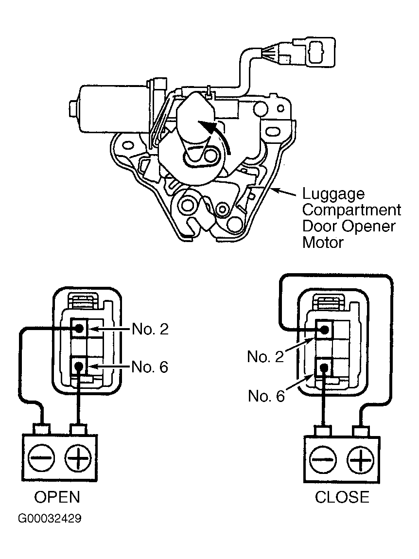 Open luggage compartment door. Disconnect 6-pin electrical connector from door opener motor. Connect positive battery lead to door opener motor connector (component side) terminal No. 6 and negative battery lead to door opener motor connector terminal No. 2. Door opener motor should operate to open position. Reverse polarity. Door should operate to close position. See Fig 1. Replace door opener motor as necessary and retest system operation.
