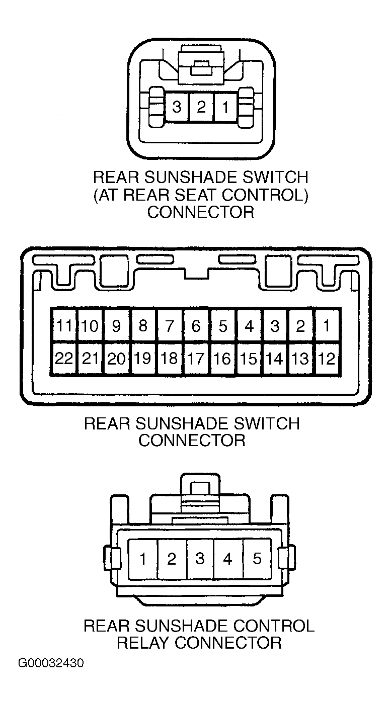 - Disconnect rear sunshade relay 5-pin connector. See Fig 1. Check wire harness side of connector. Replace rear sunshade relay as necessary. If relay is okay, reconnect relay connector. Backprobe connector at wire harness side. See REAR SUNSHADE RELAY TEST table.